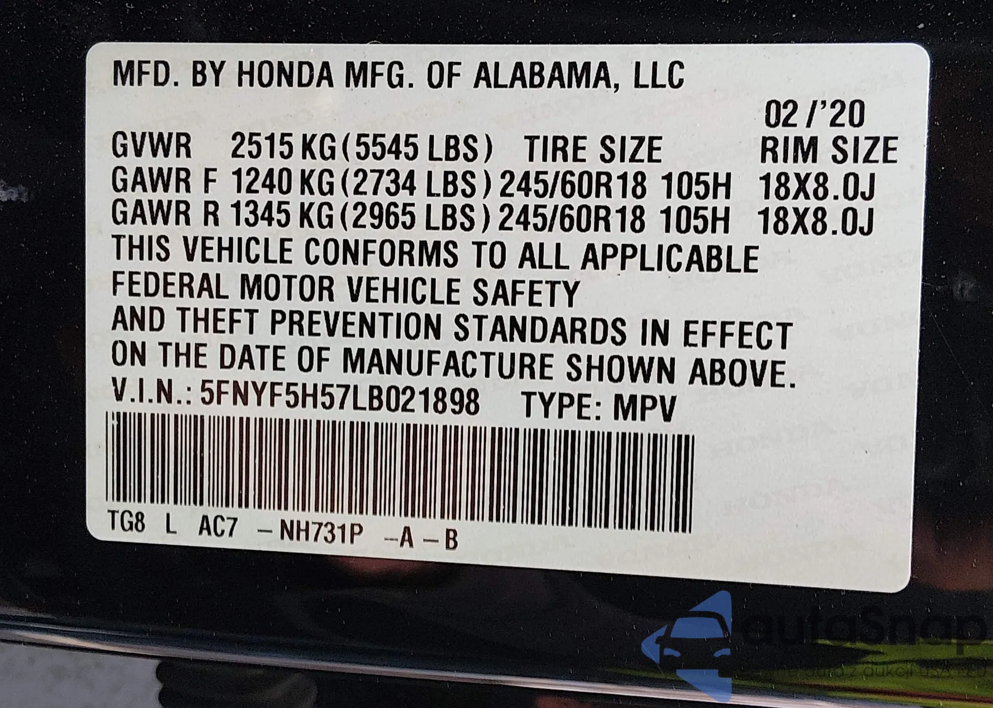 • VIN 5FNYF5H57LB021898