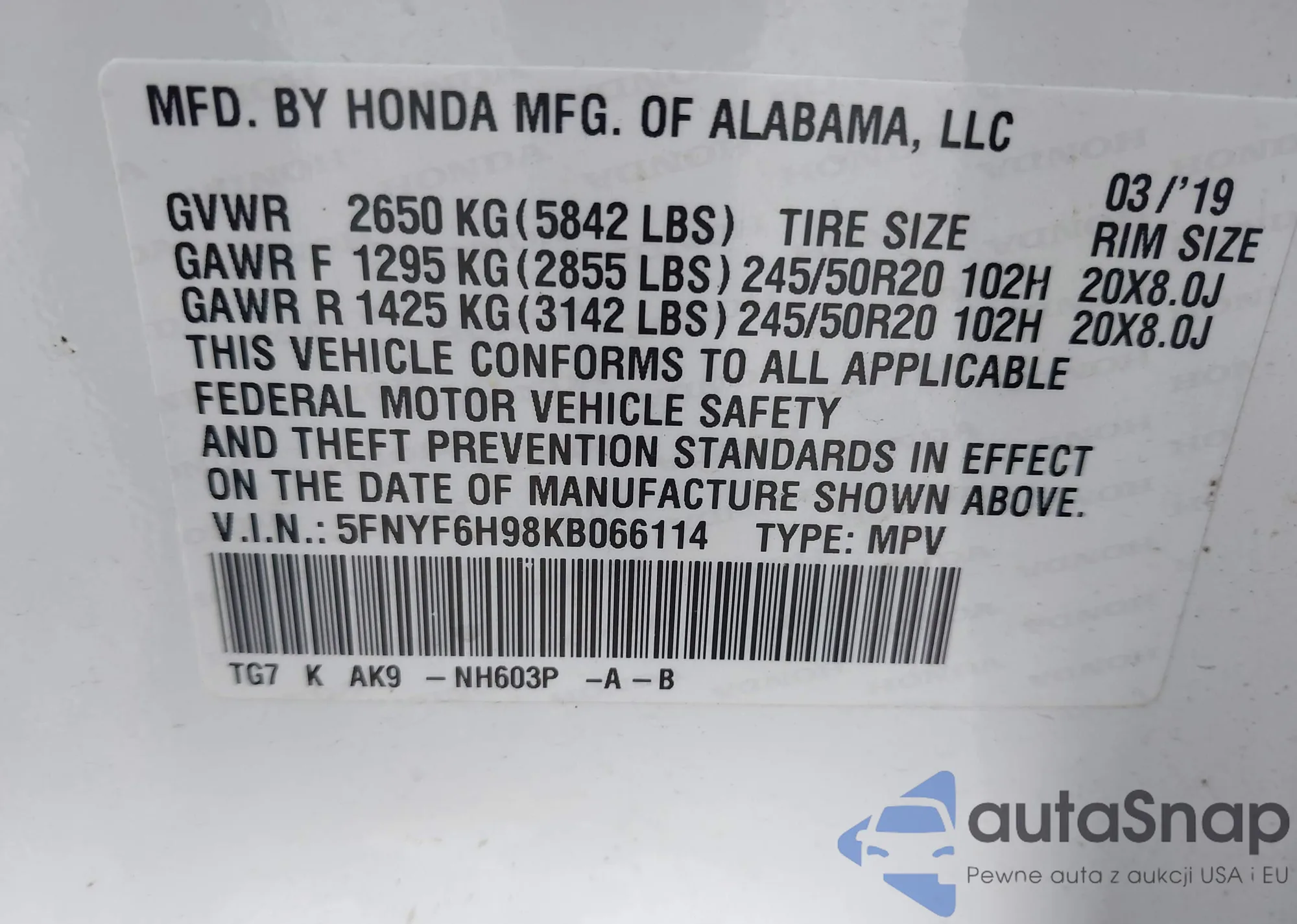 LOT: 43718089 VIN: 5FNYF6H98KB066114