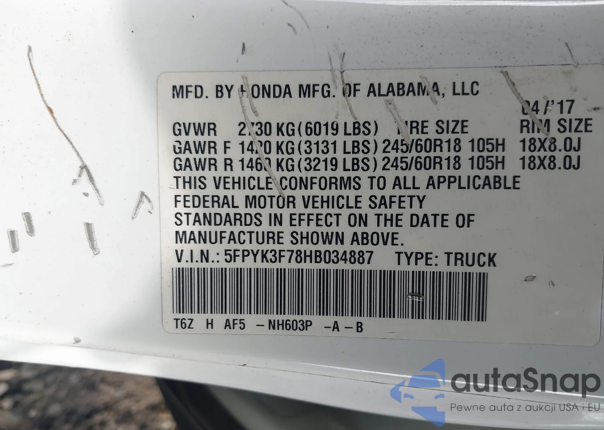 • VIN 5FPYK3F78HB034887
