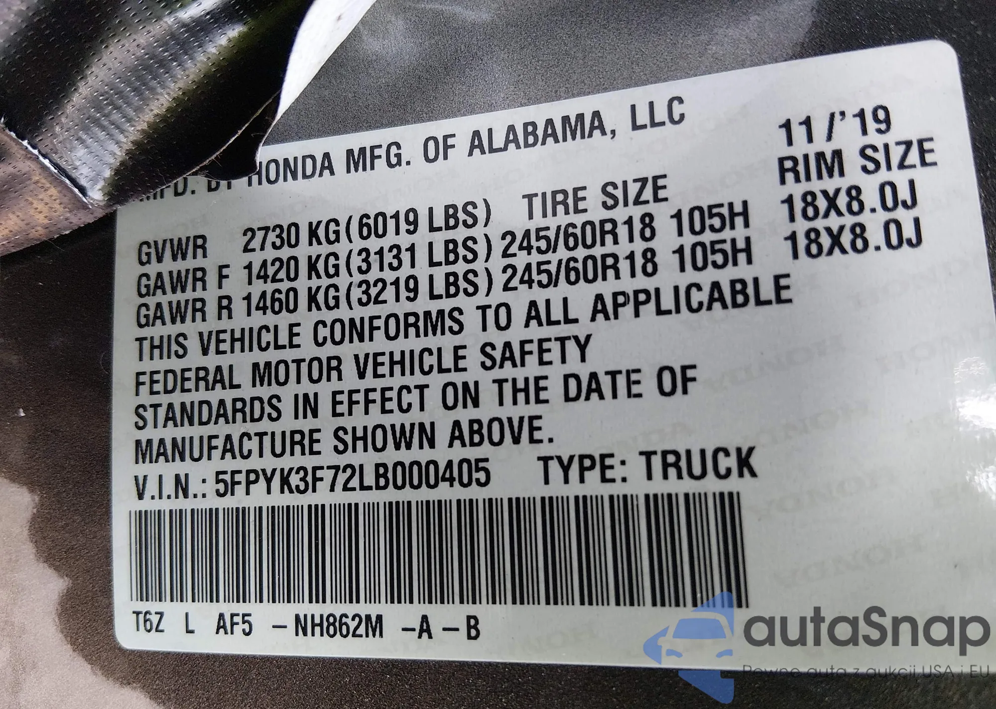 • VIN 5FPYK3F72LB000405