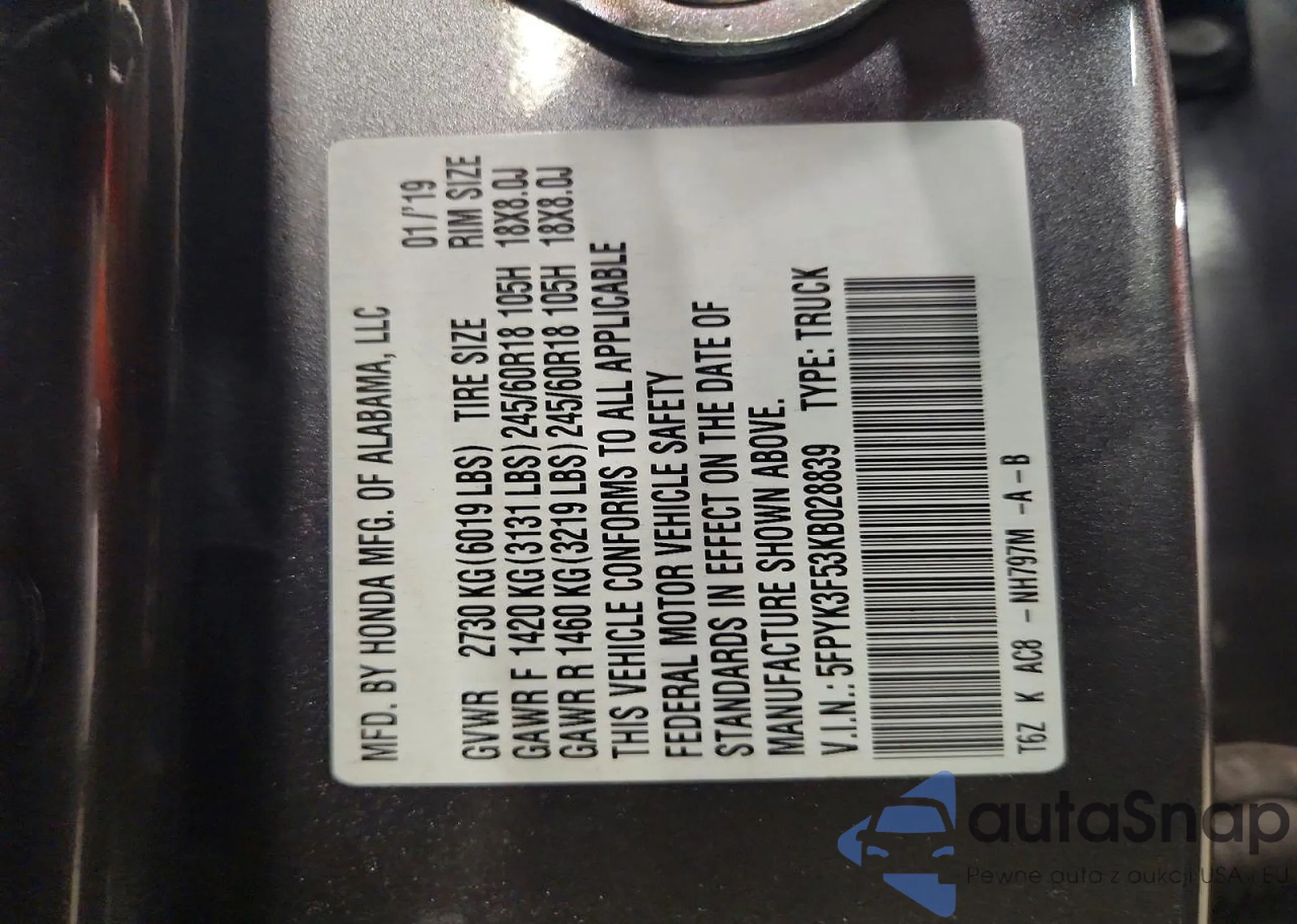• VIN 5FPYK3F53KB028839