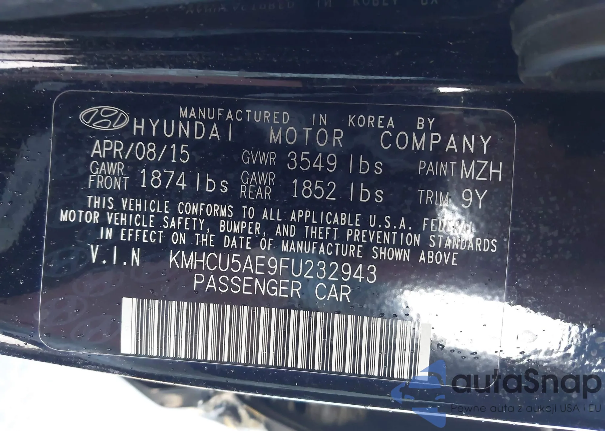 LOT: 44433359 VIN: KMHCU5AE9FU232943