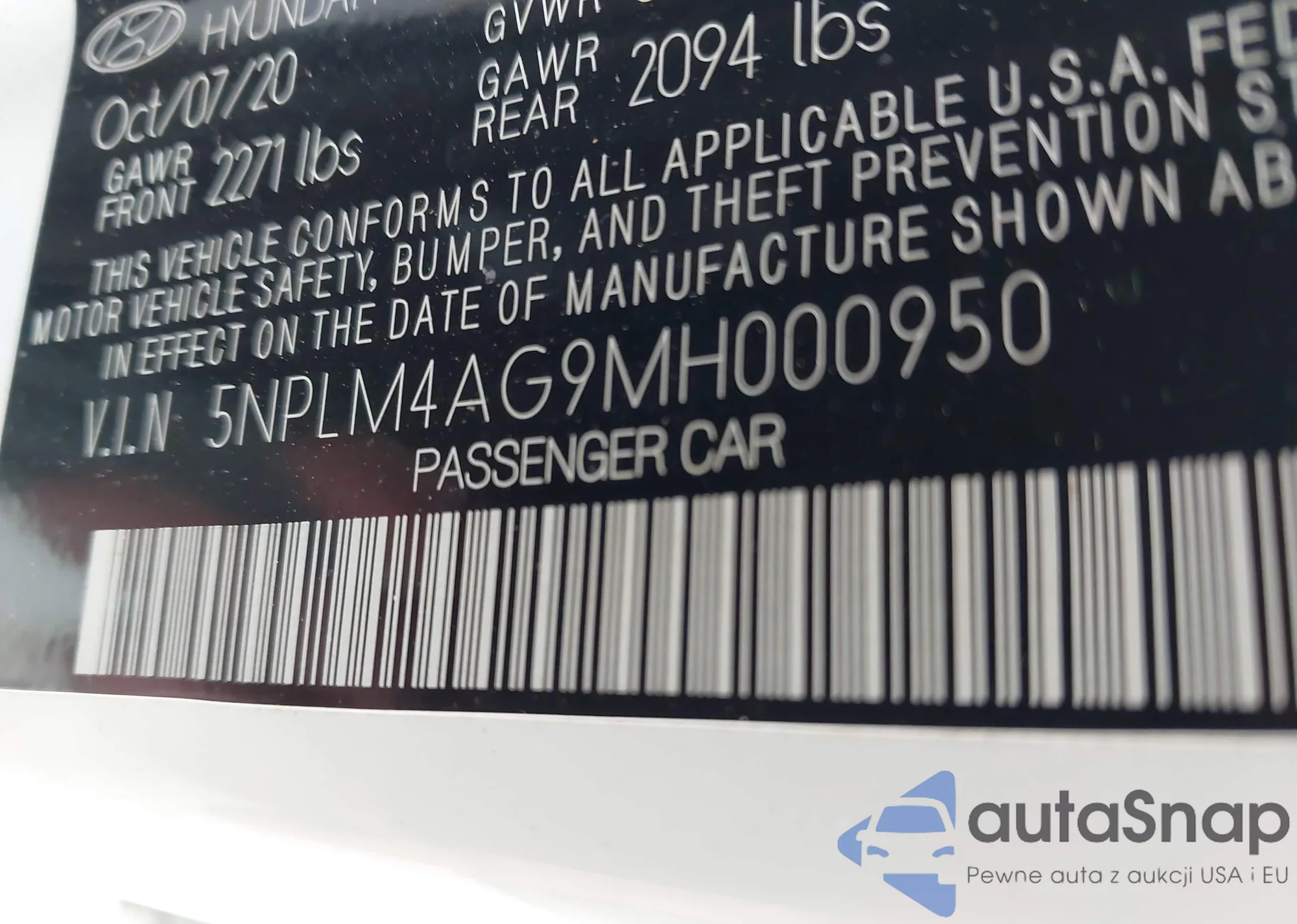 LOT: 43828733 VIN: 5NPLM4AG9MH000950