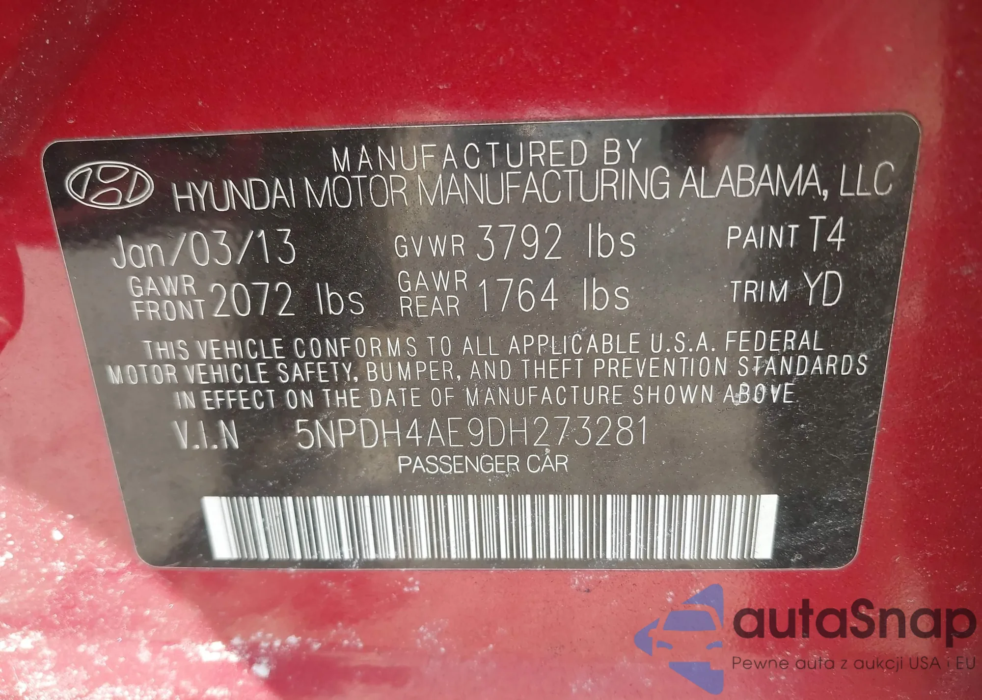 • VIN 5NPDH4AE9DH273281