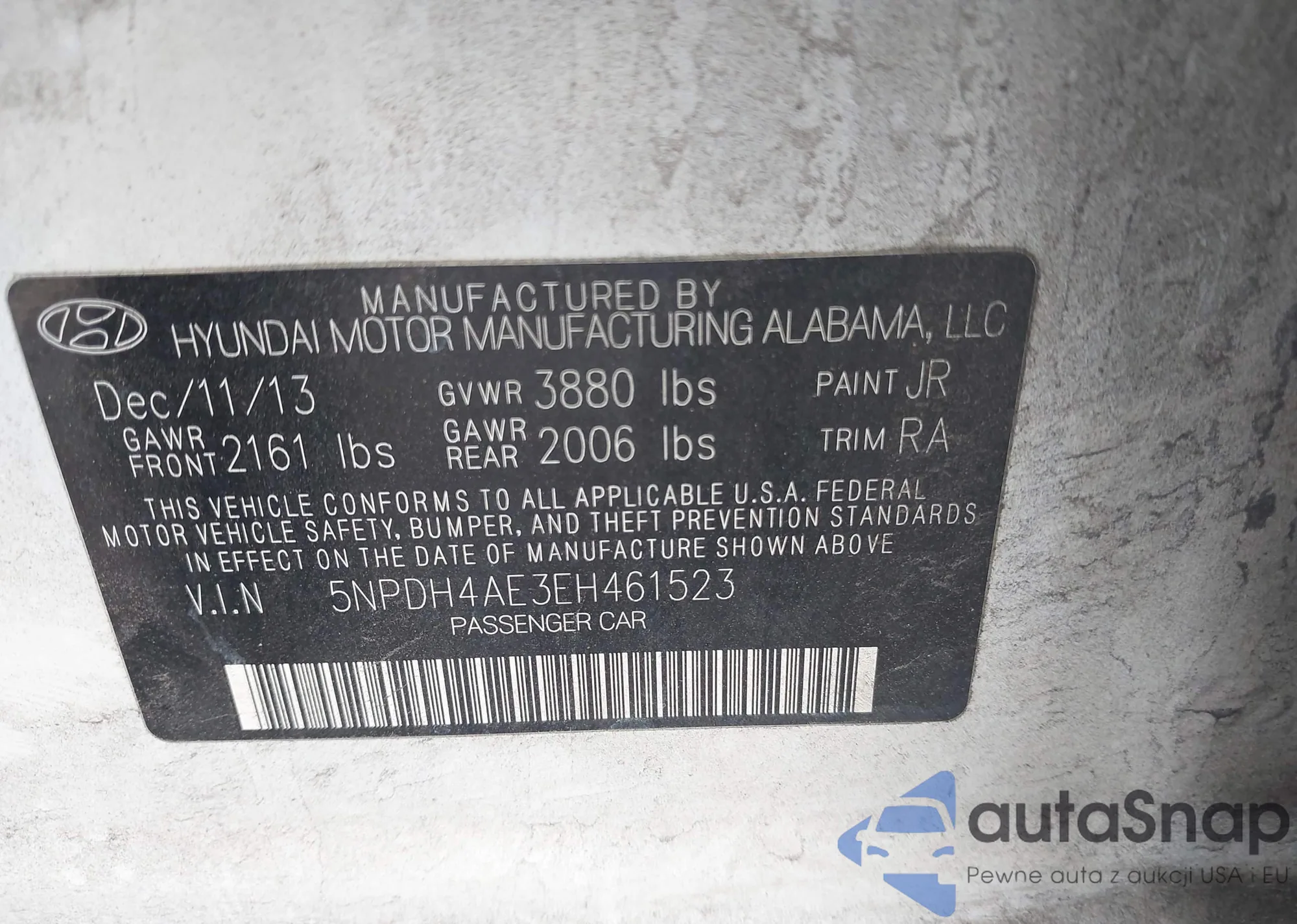 LOT: 44172157 VIN: 5NPDH4AE3EH461523