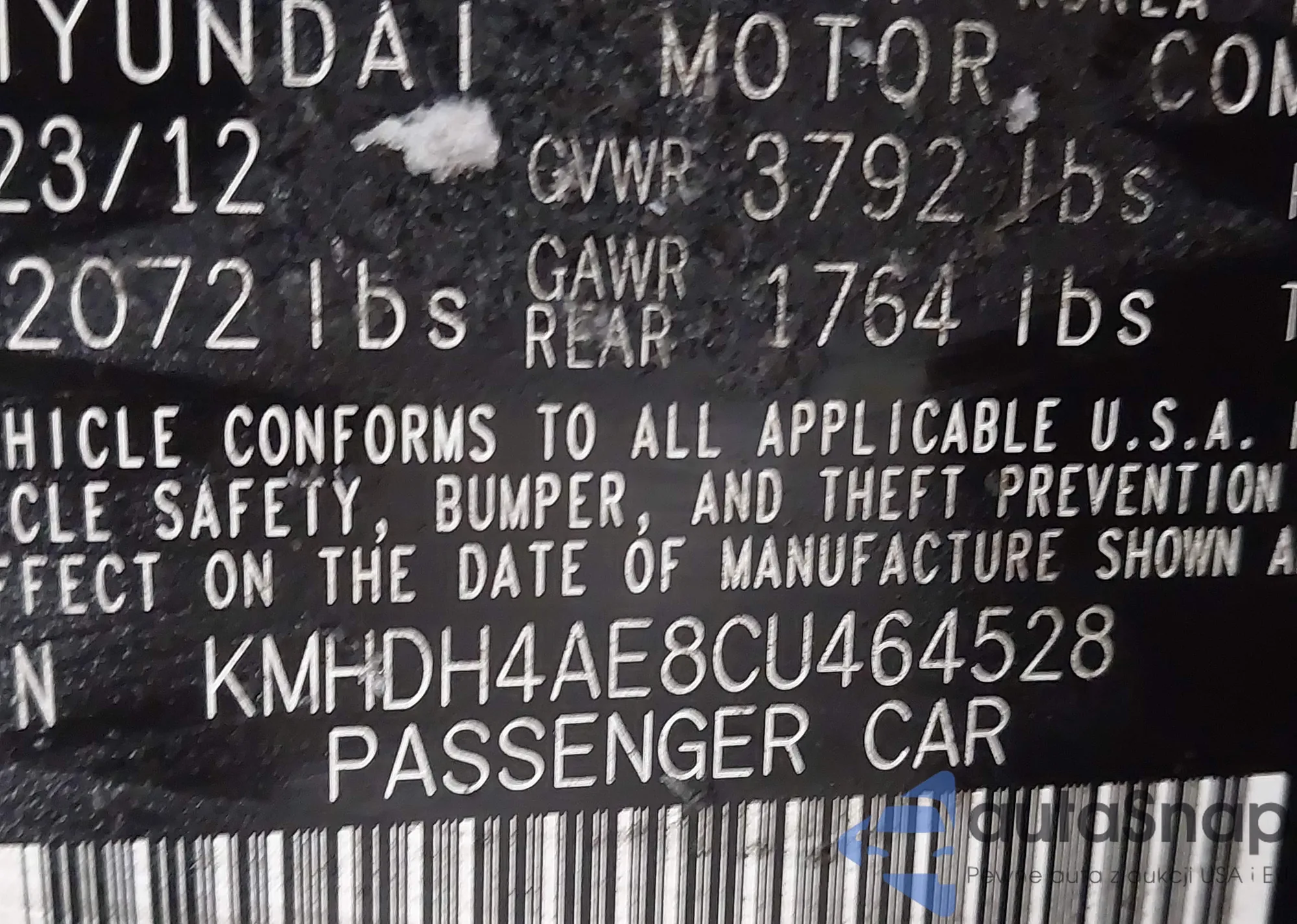 LOT: 41629335 VIN: KMHDH4AE8CU464528