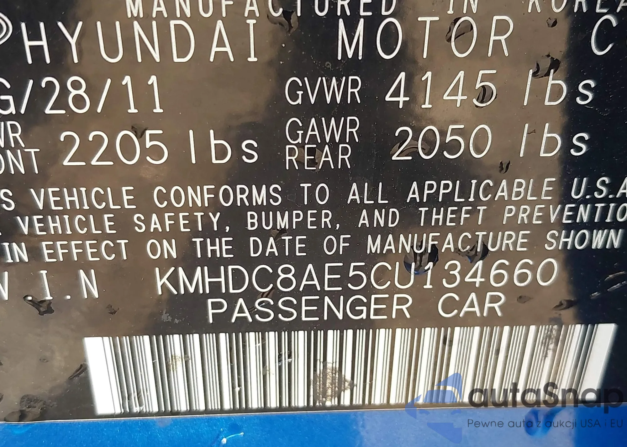 LOT: 43286120 VIN: KMHDC8AE5CU134660