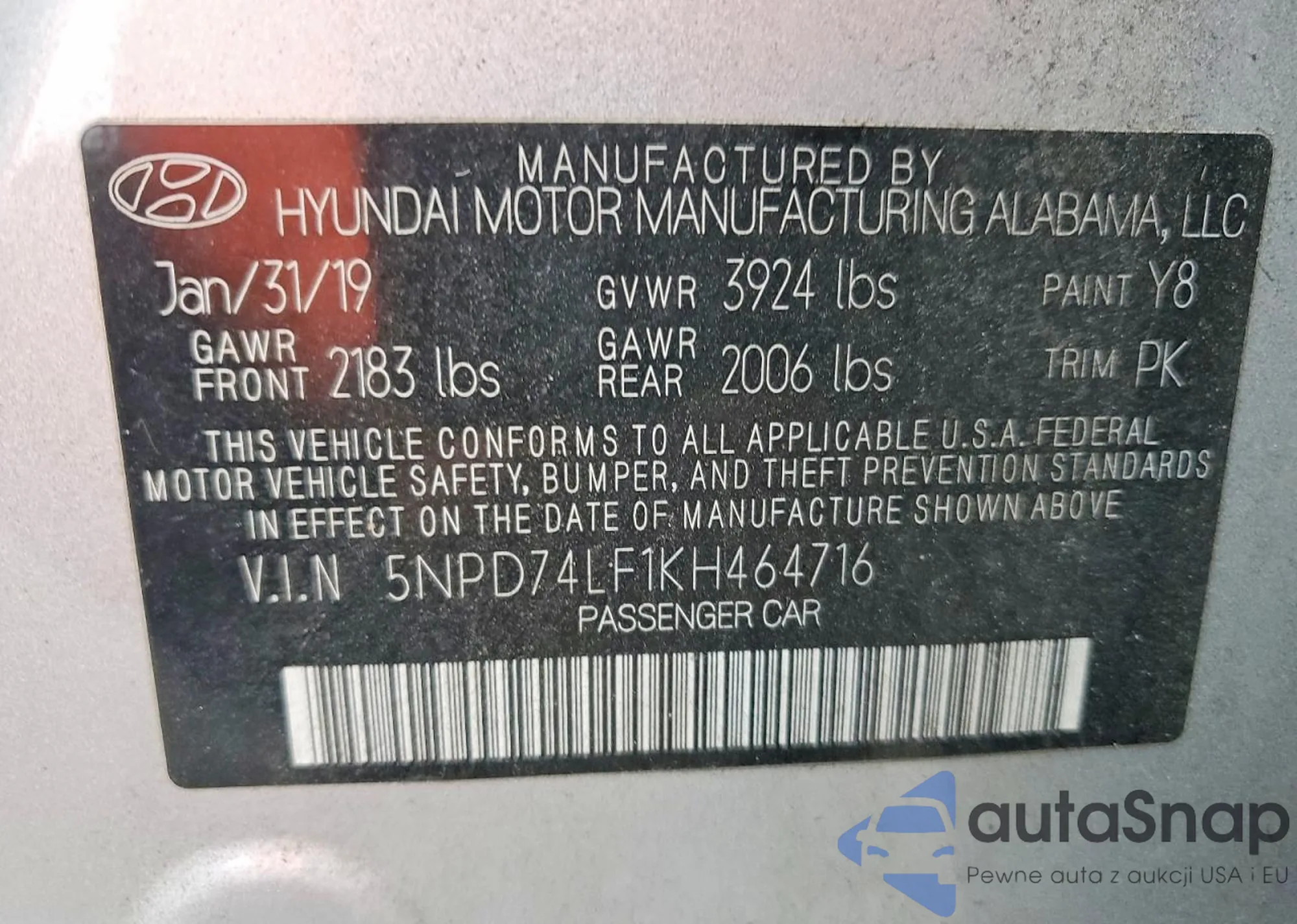 LOT: 99306025 VIN: KMHD84LF8KU746124