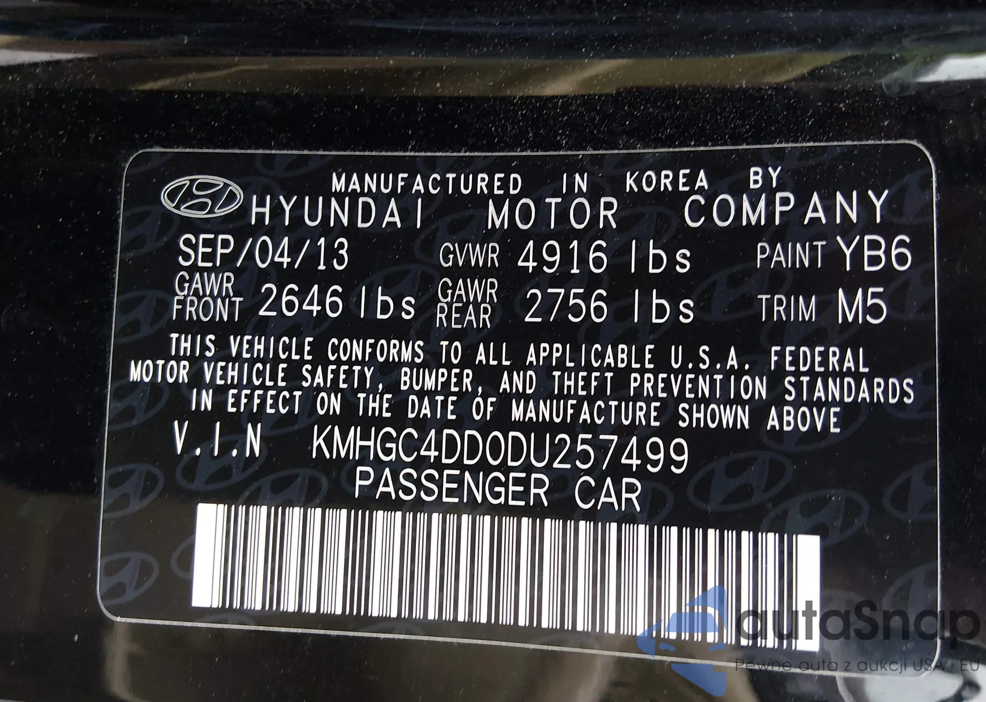 LOT: 44392399 VIN: KMHGC4DD0DU257499