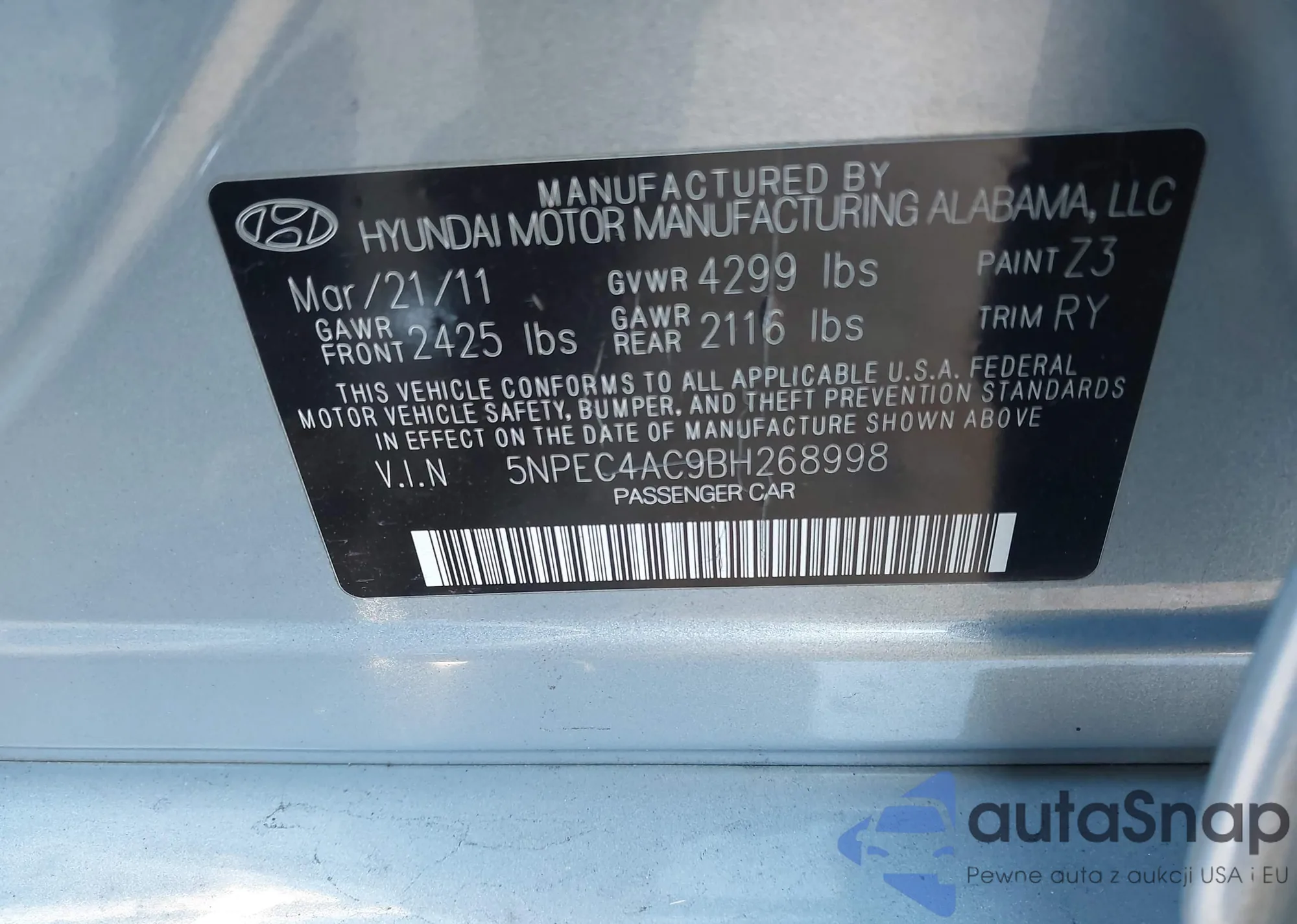 • VIN 5NPEC4AC9BH268998