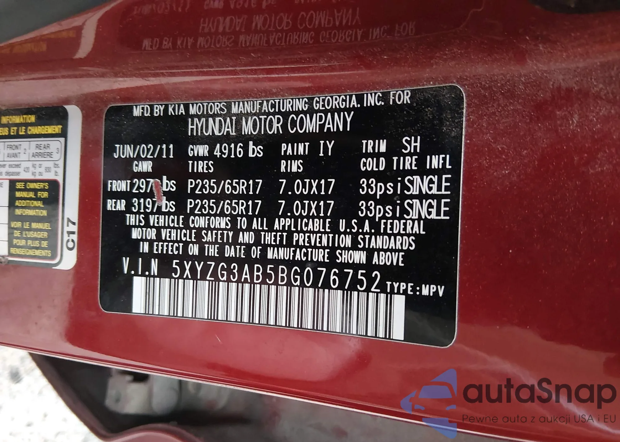 • VIN 5XYZG3AB5BG076752