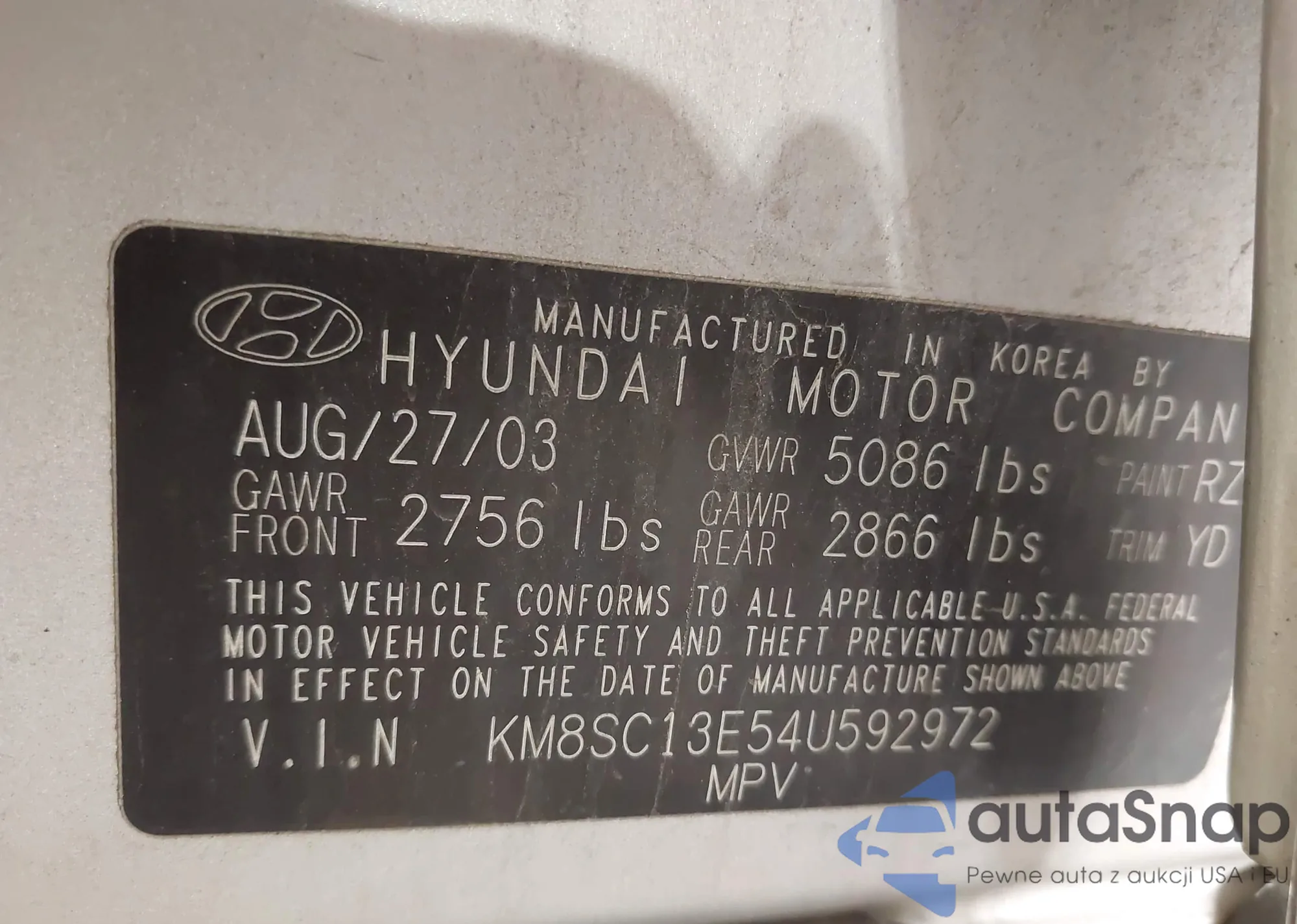 LOT: 44403198 VIN: KM8SC13E54U592972