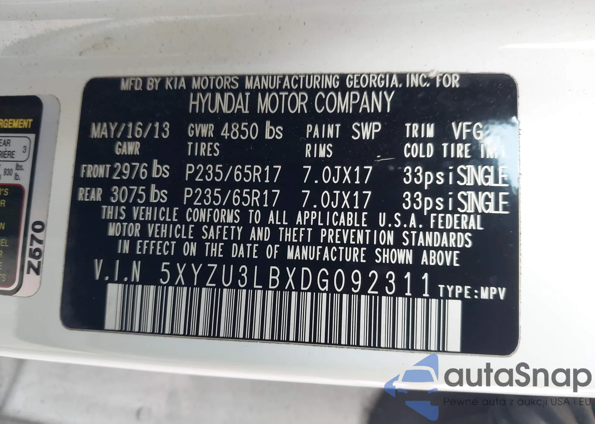 • VIN 5XYZU3LBXDG092311