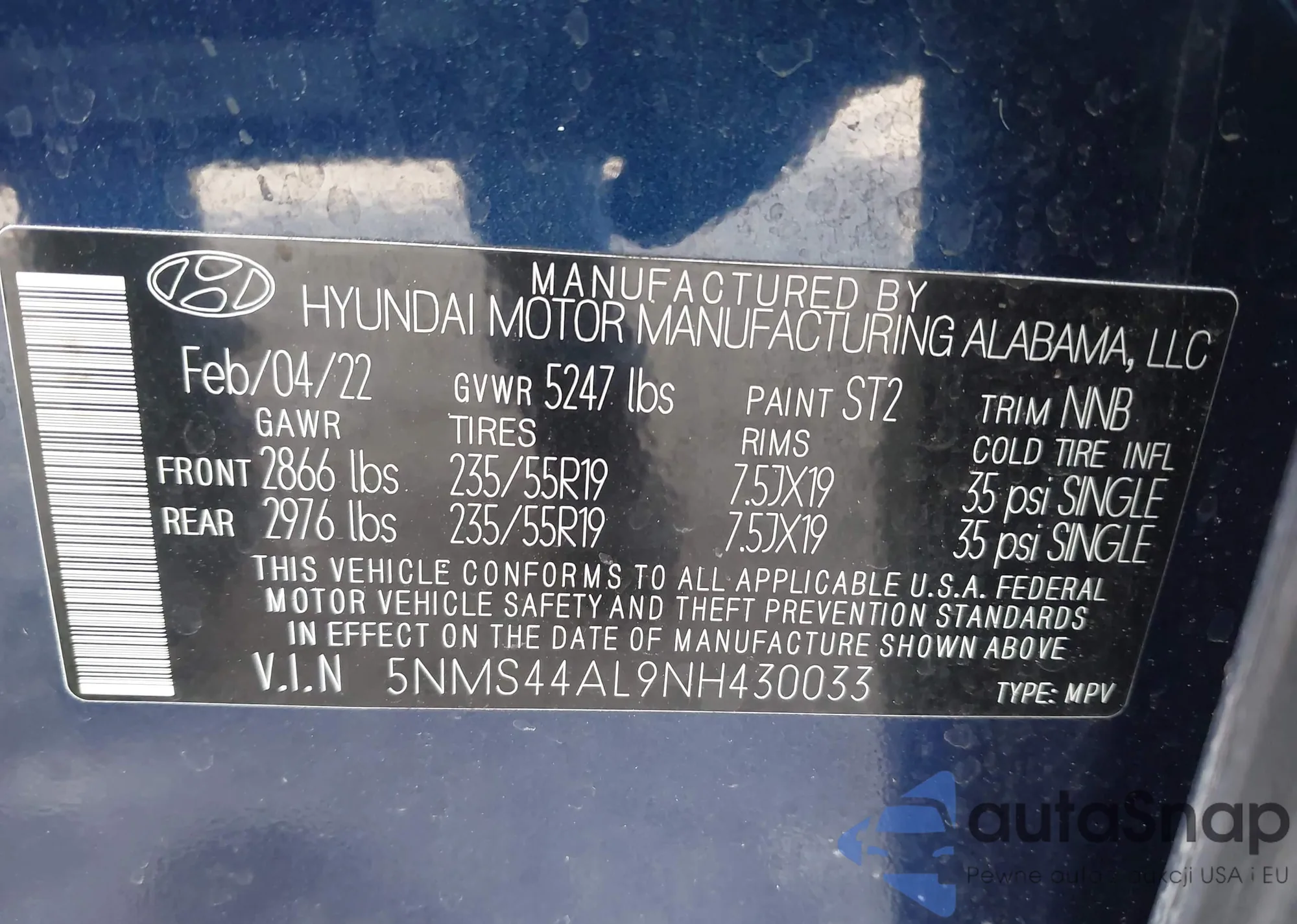 • VIN 5NMS44AL9NH430033
