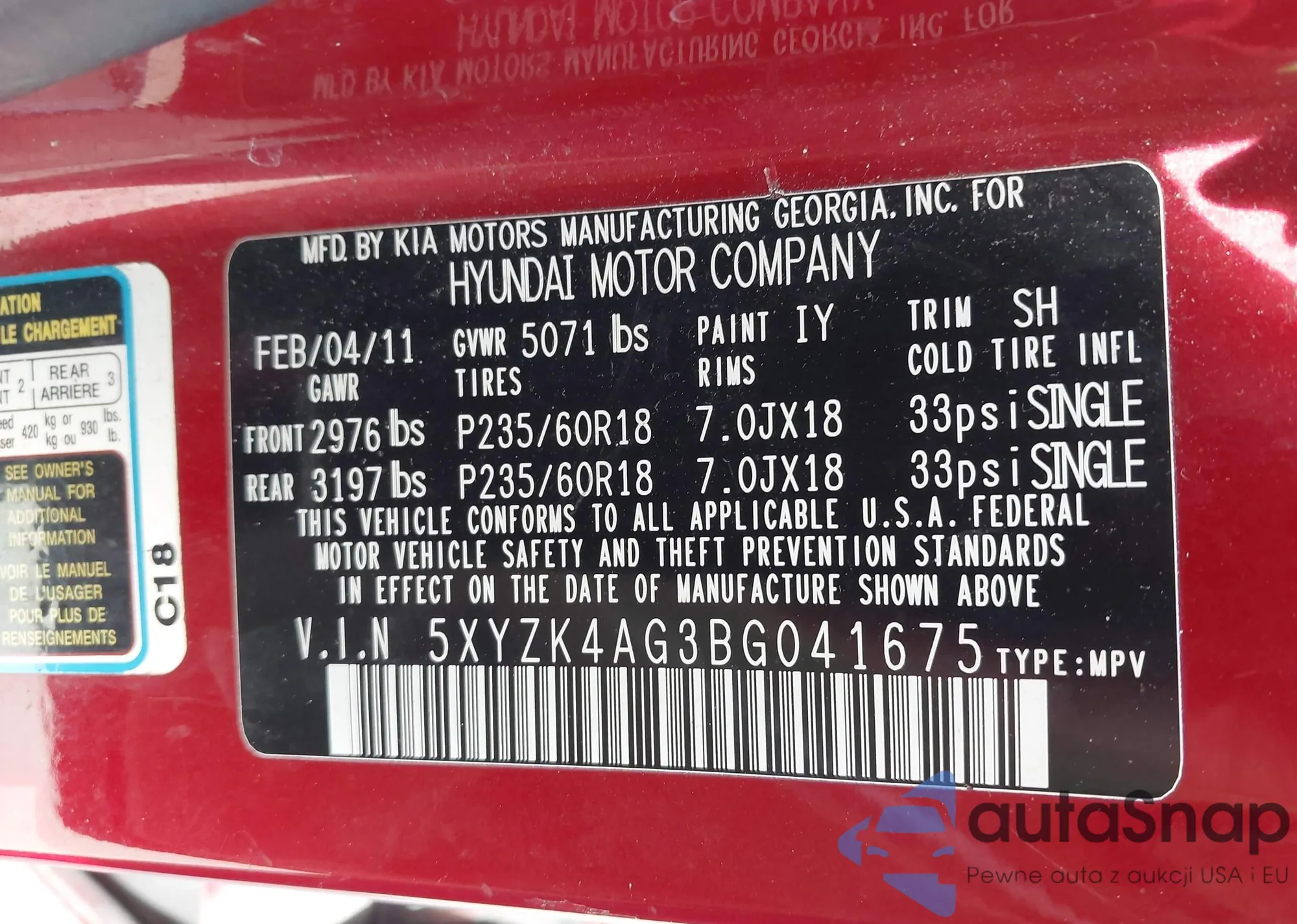 • VIN 5XYZK4AG3BG041675