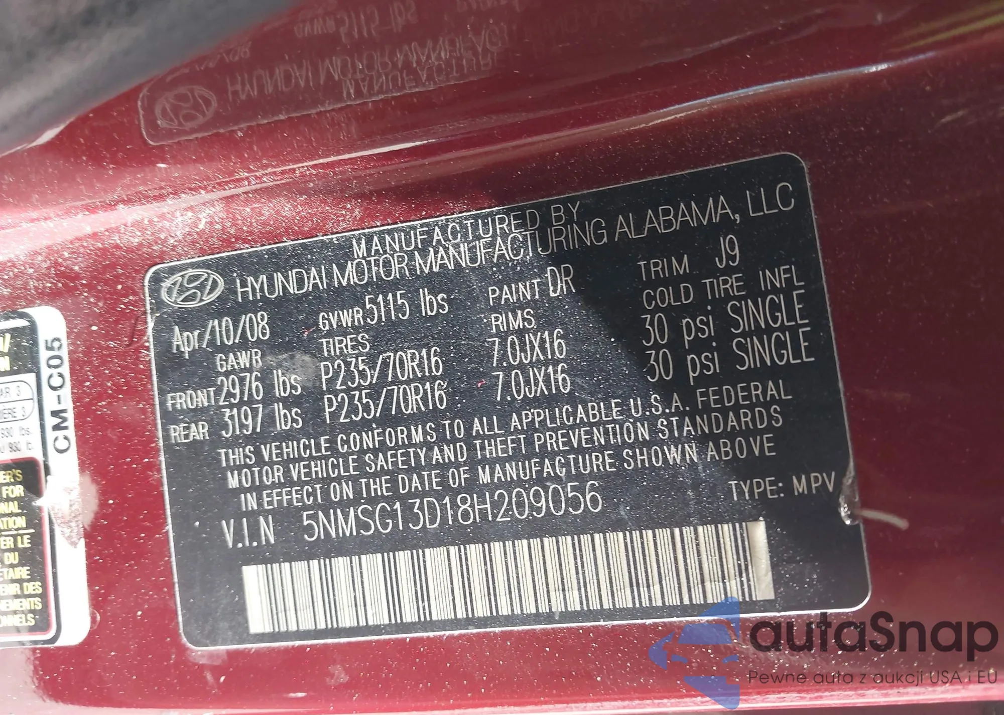 LOT: 44464185 VIN: 5NMSG13D18H209056
