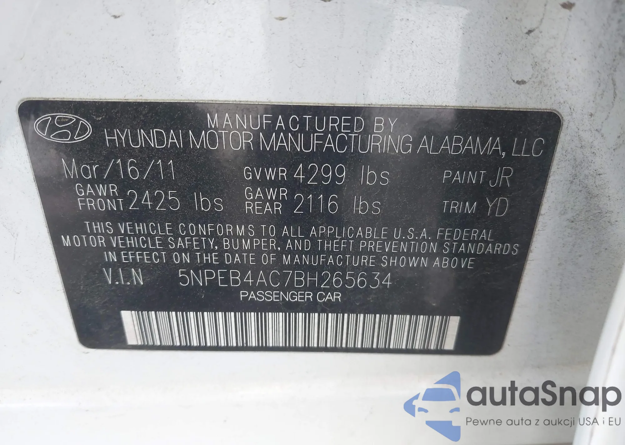 LOT: 44256953 VIN: 5NPEB4AC7BH265634