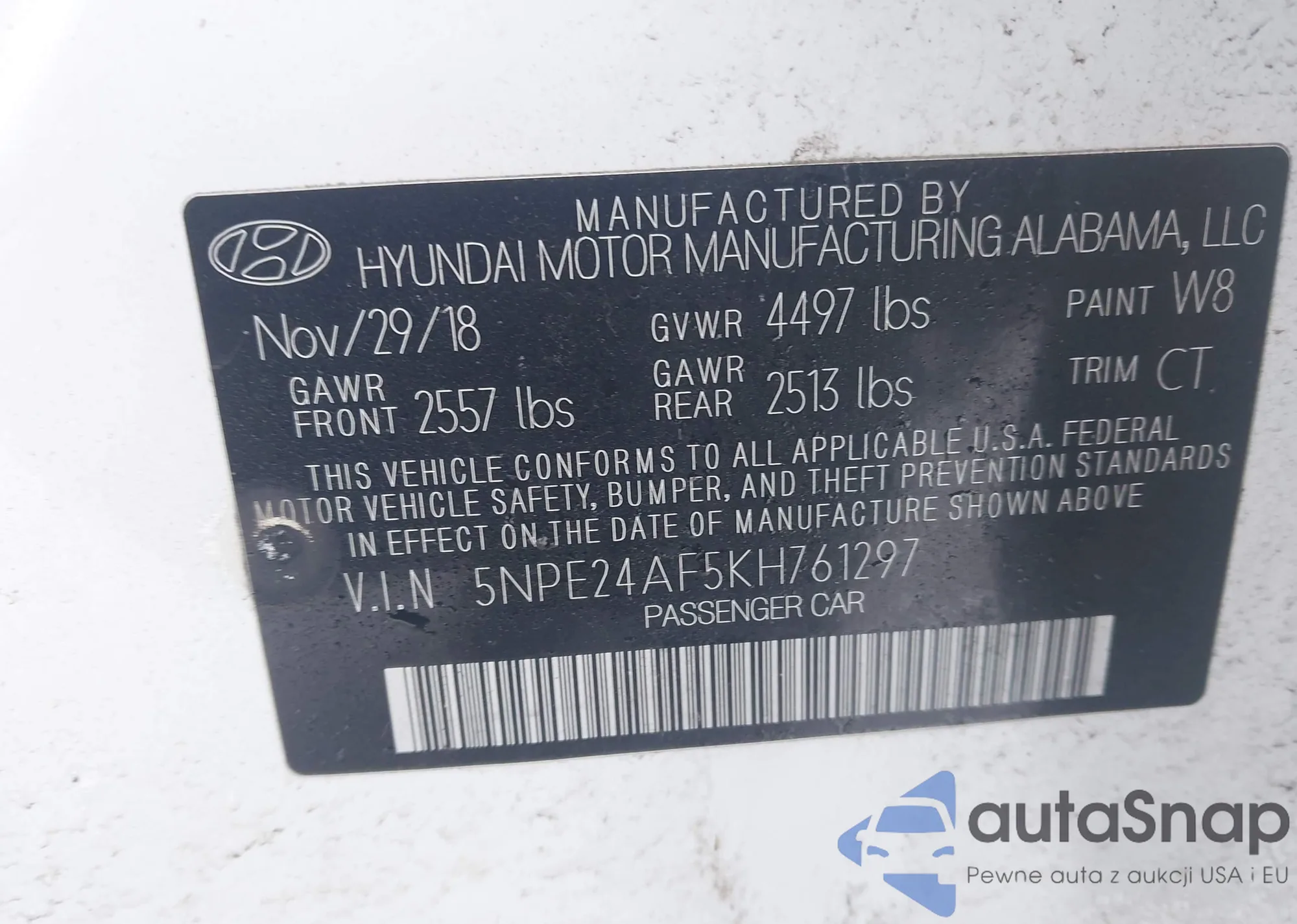 • VIN 5NPE24AF5KH761297