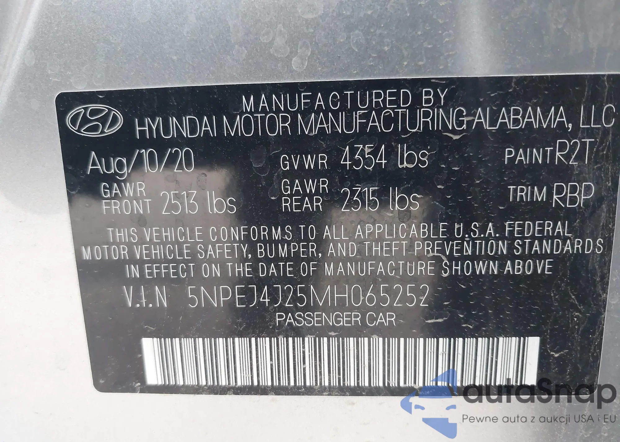 LOT: 44291636 VIN: 5NPEJ4J25MH106933