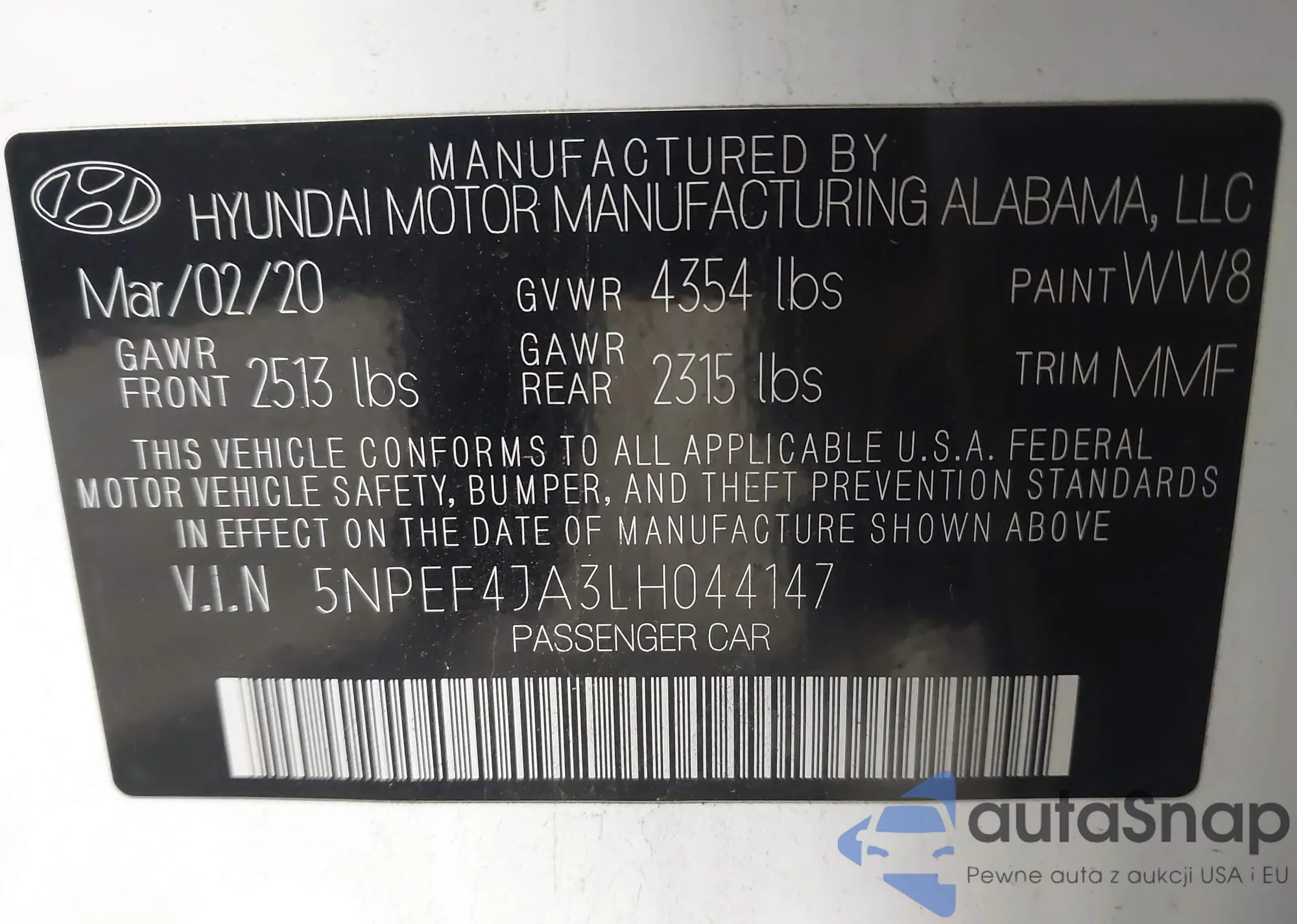 LOT: 43890387 VIN: 5NPEF4JA3LH044147
