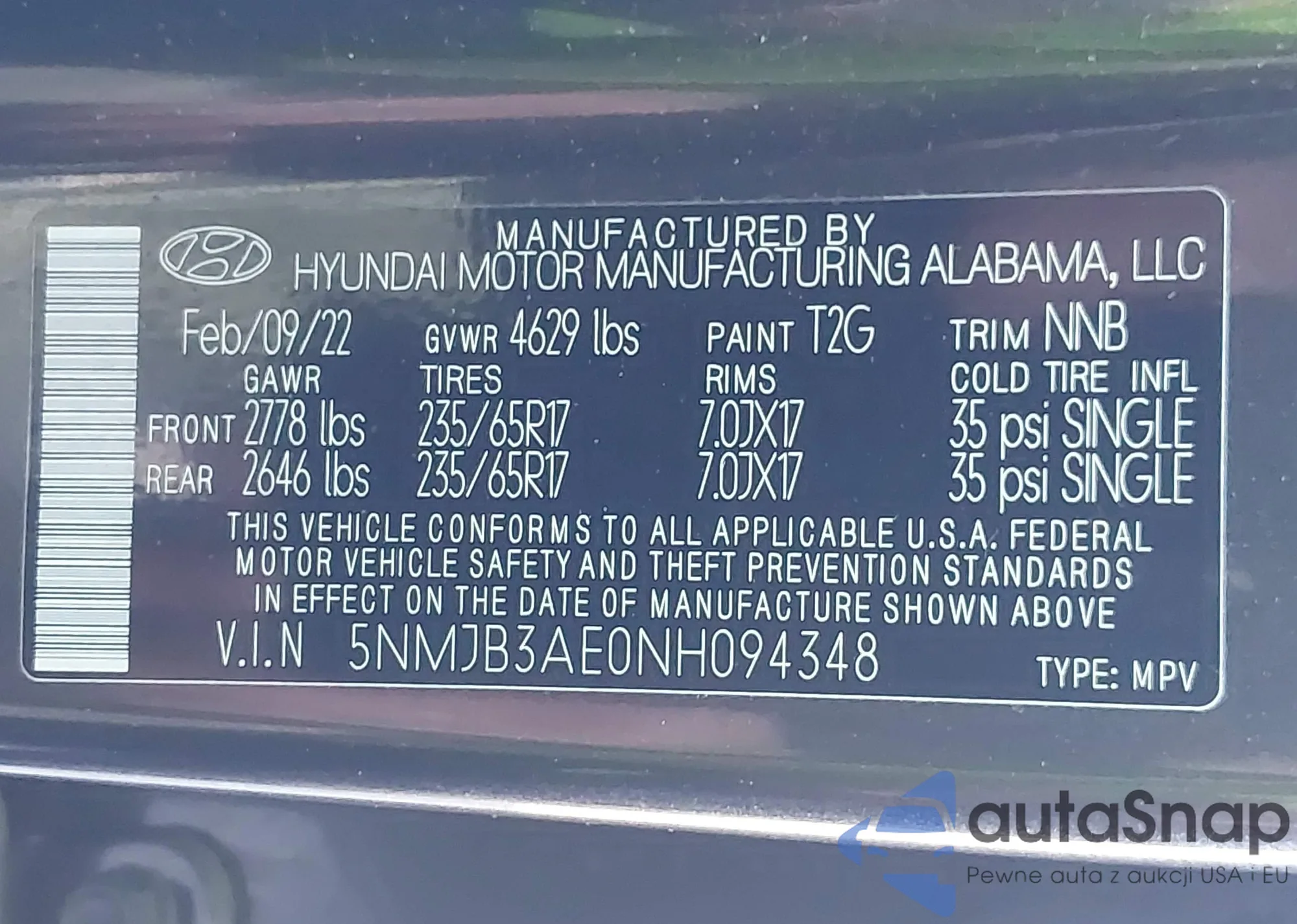 • VIN 5NMJB3AE0NH094348