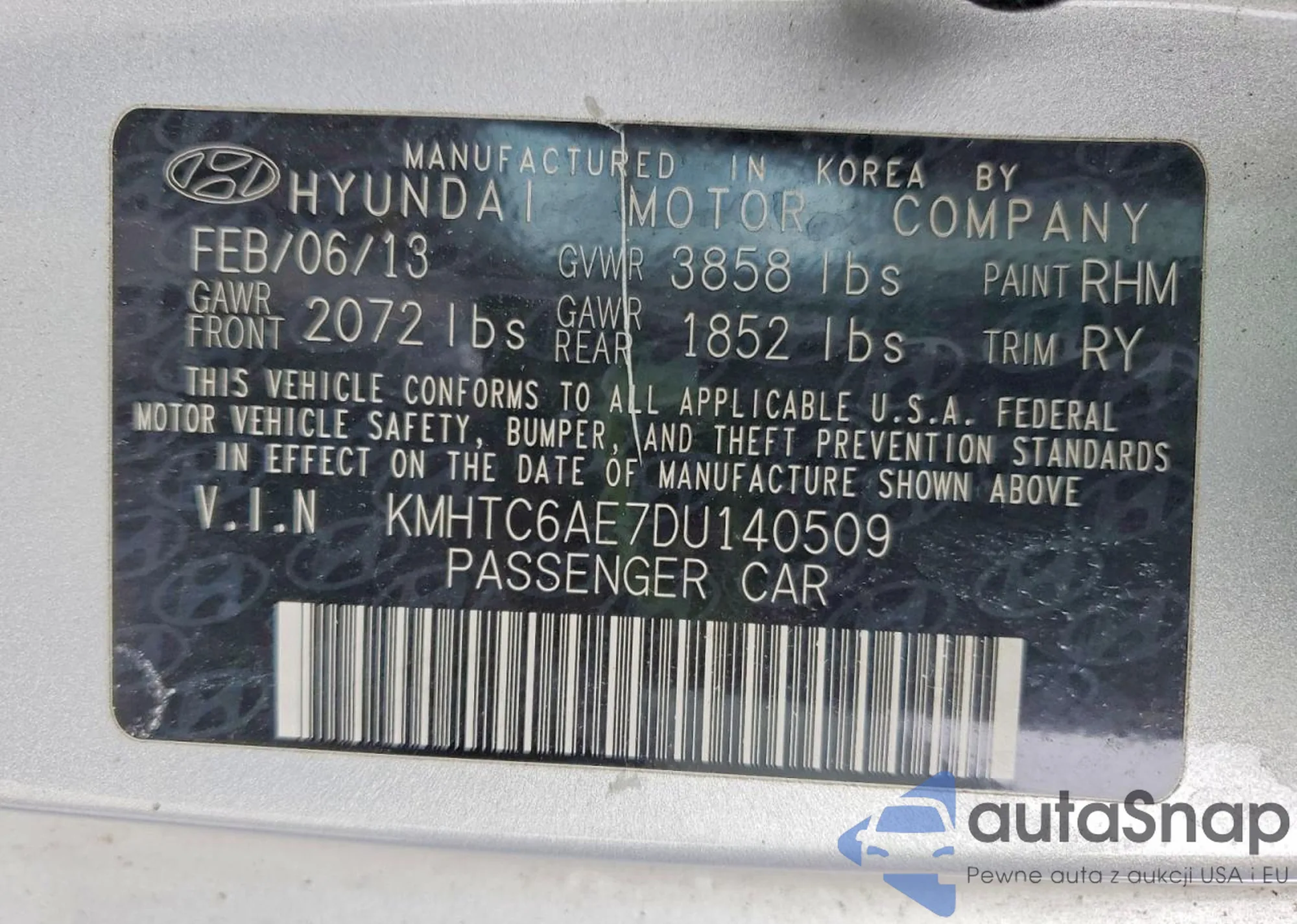 • VIN KMHTC6AE7DU140509