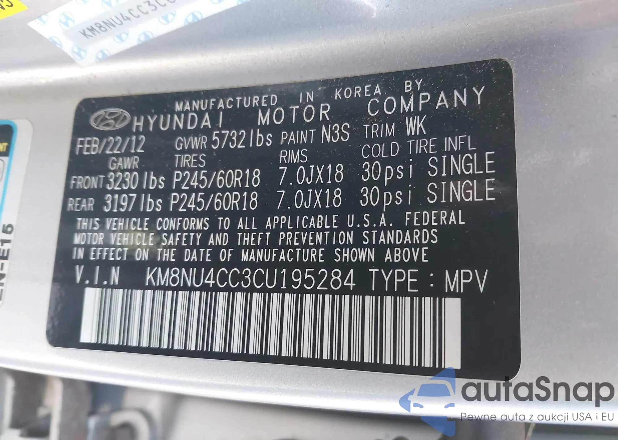 LOT: 44409074 VIN: KM8NU4CC3CU195284