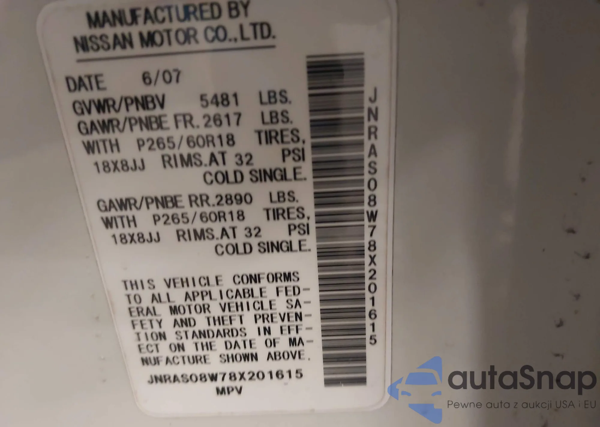 LOT: 44353063 VIN: JNRAS08W78X201615