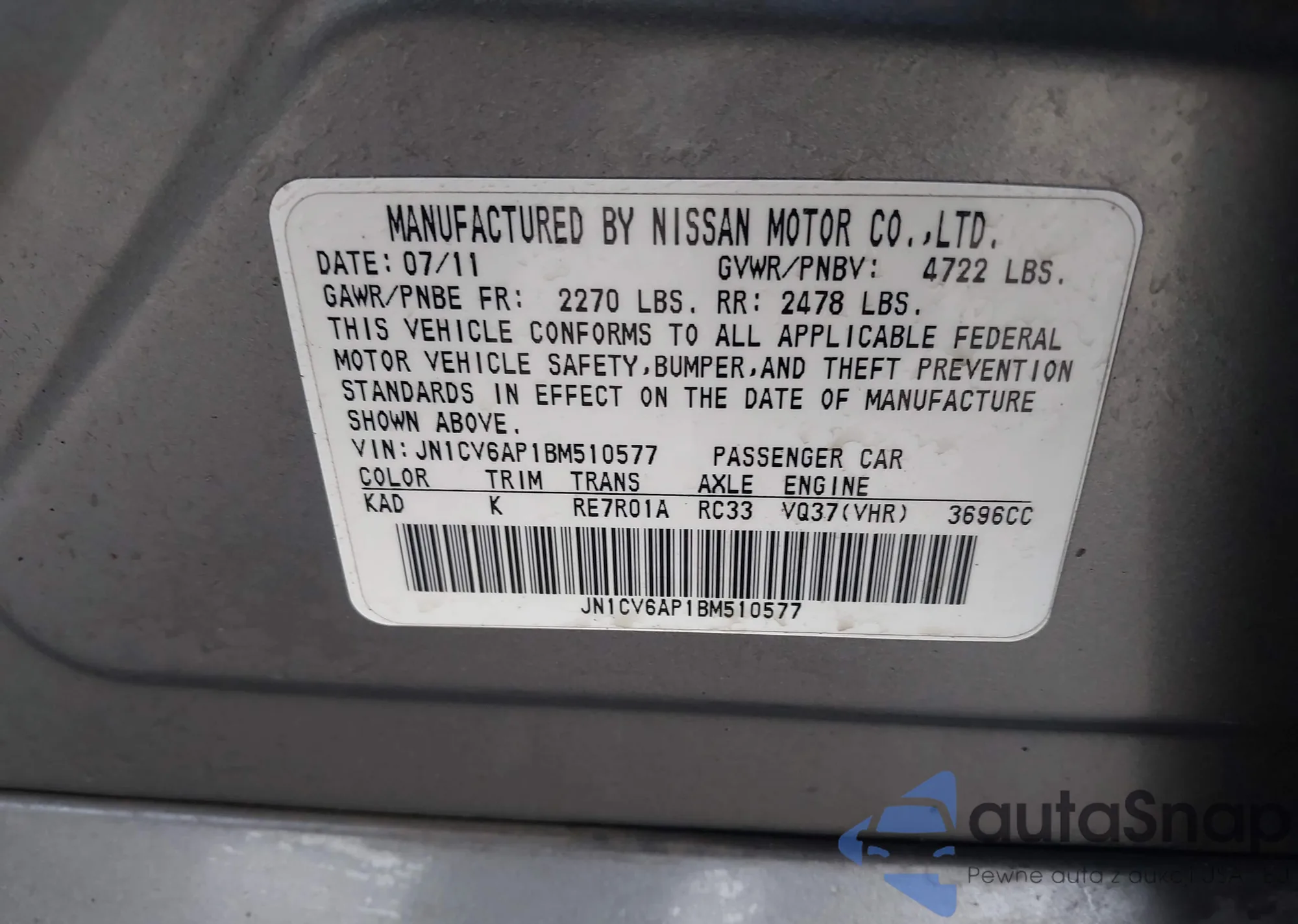 LOT: 44259548 VIN: JN1CV6AP1BM510577