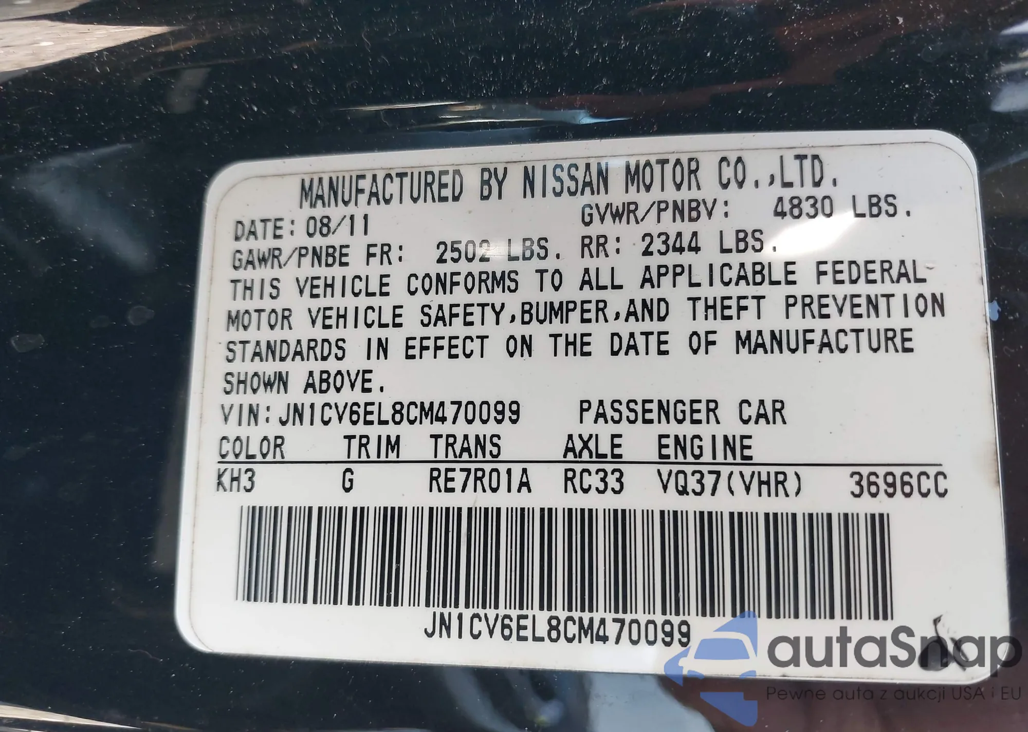LOT: 44346295 VIN: JN1CV6EL8CM470099