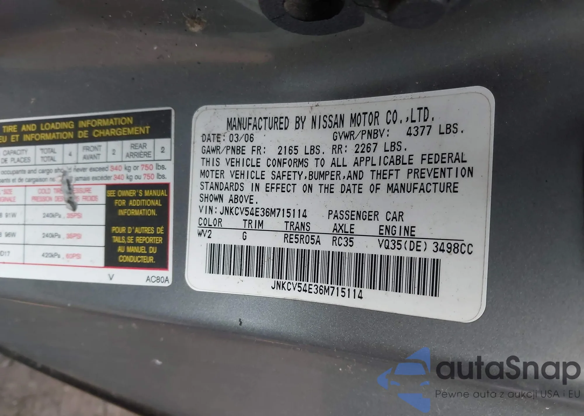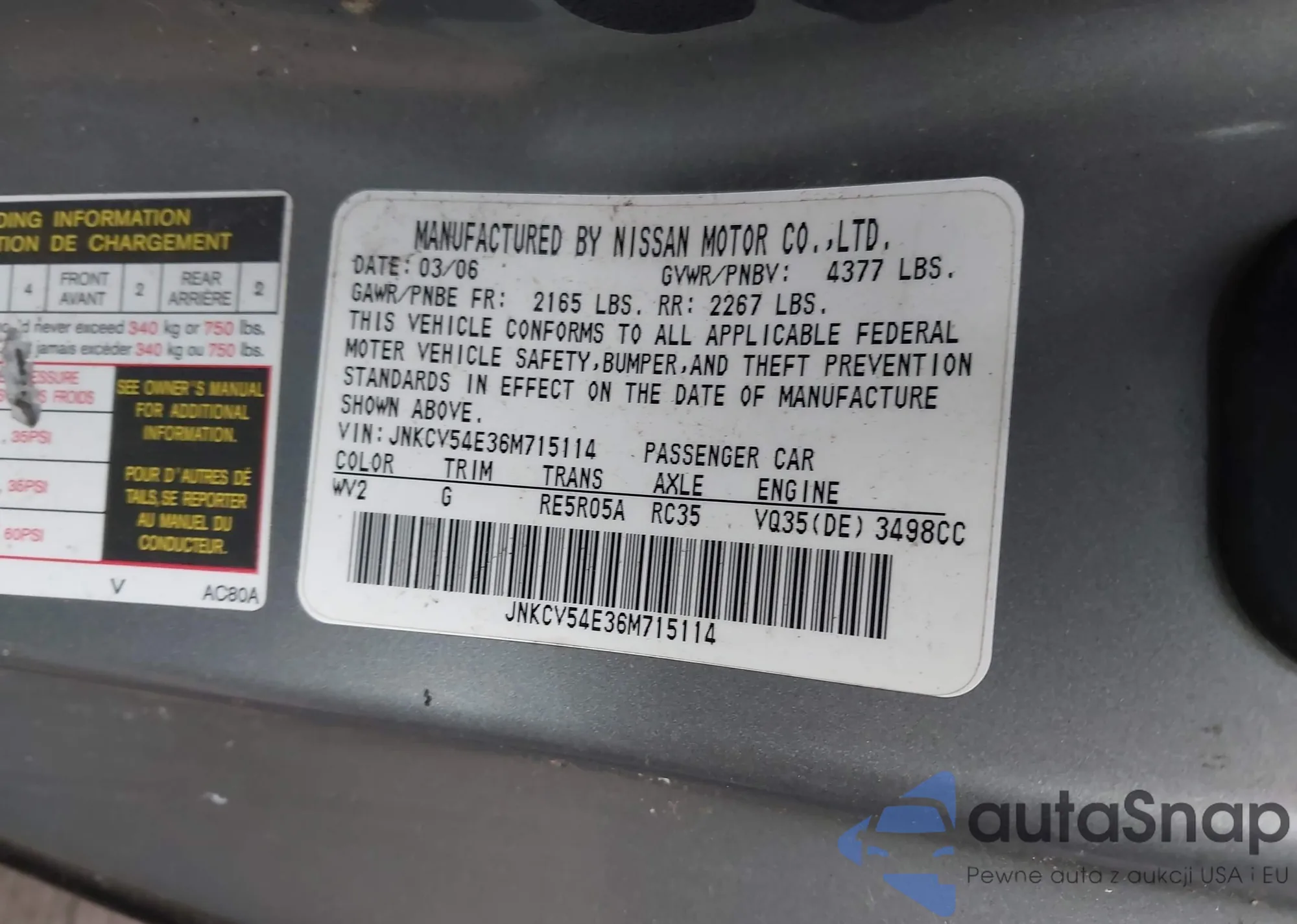 2006 Infiniti G35 z USA, uszkodzony, nr VIN JNKCV54E36M715114