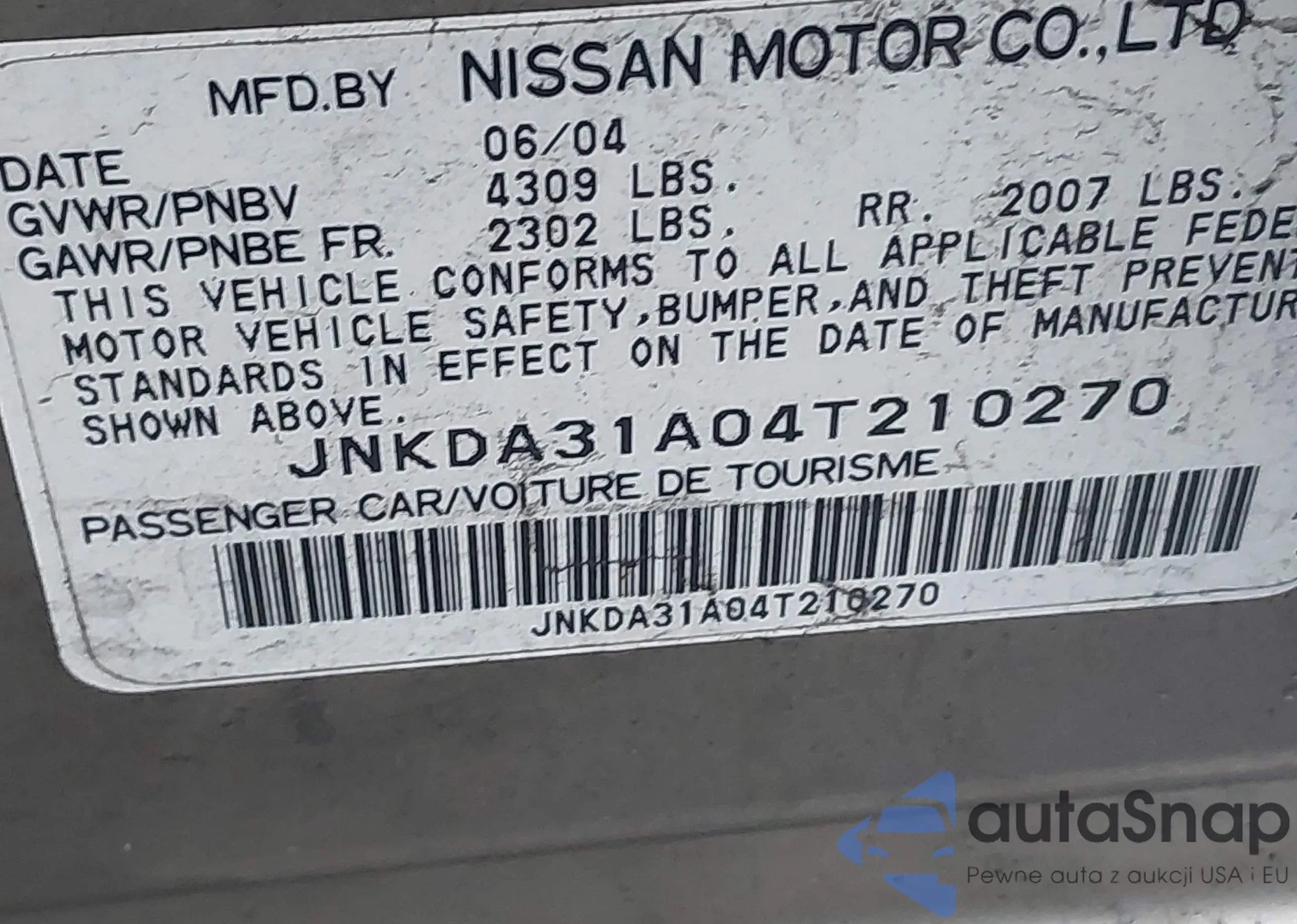 • VIN JNKDA31A04T210270
