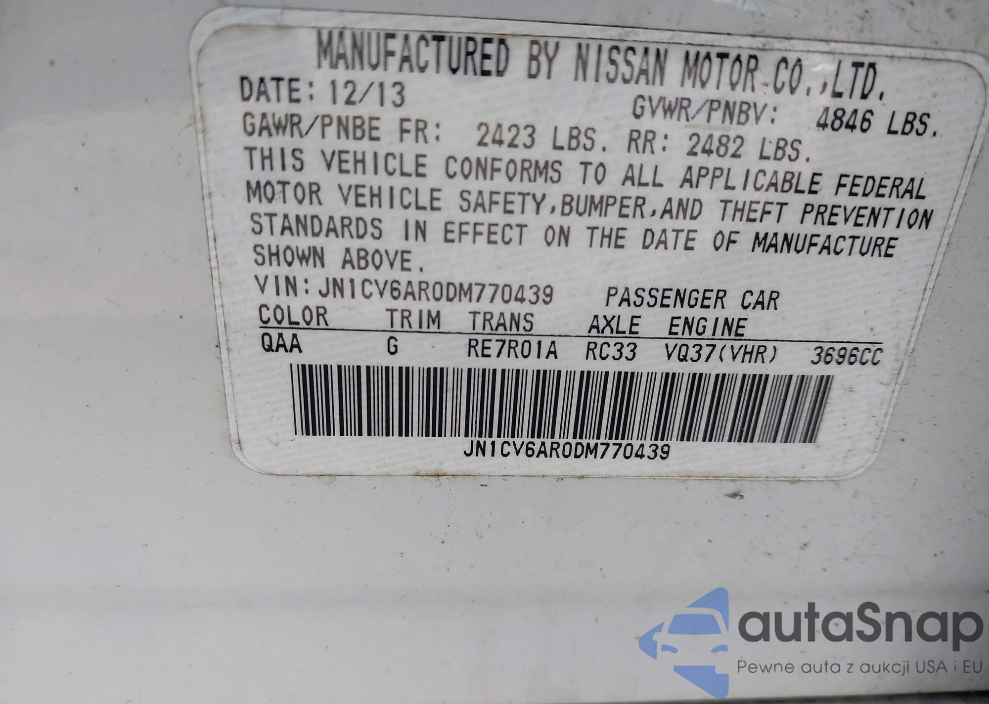 LOT: 44414328 VIN: JN1CV6AR0DM770439