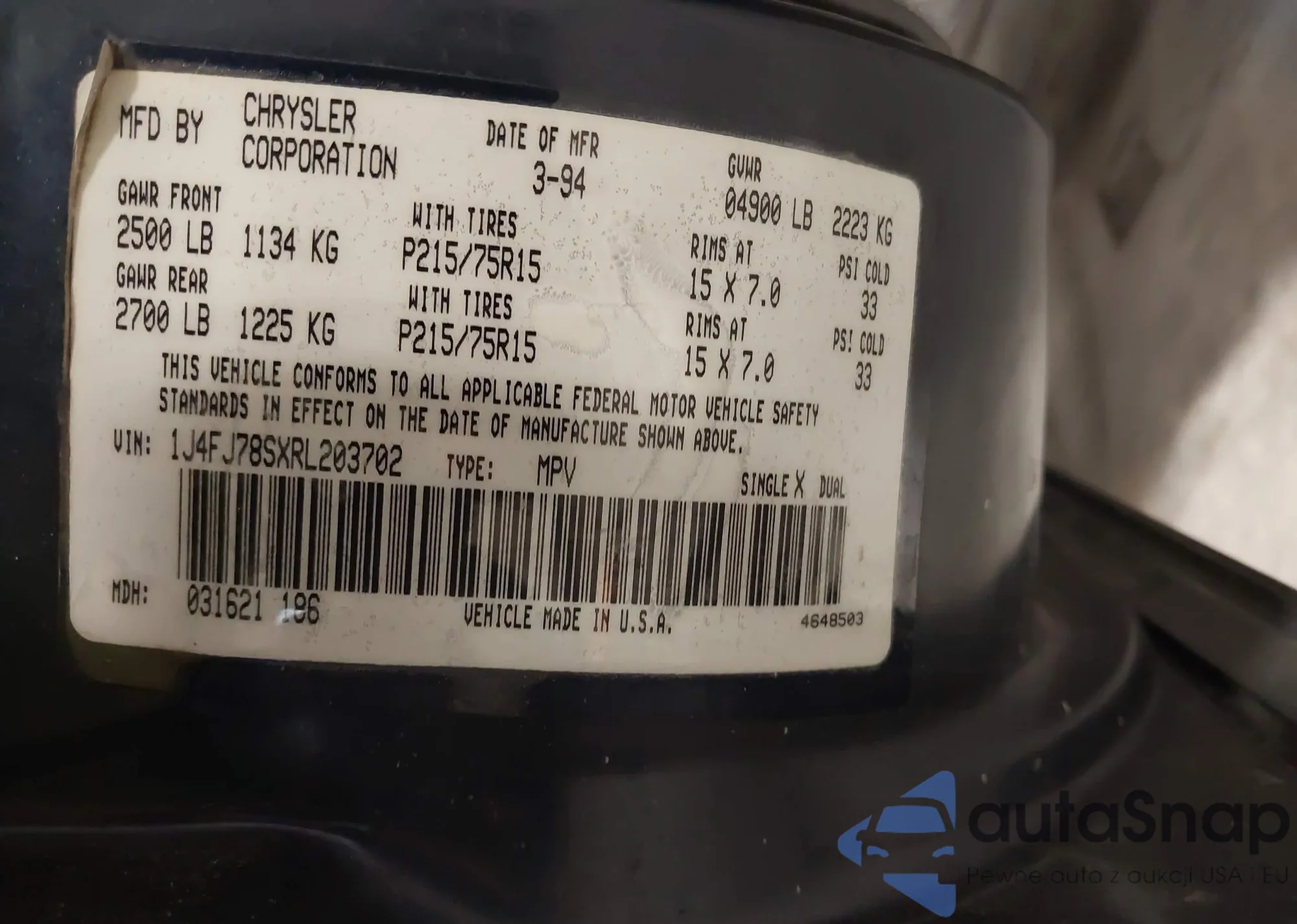 • VIN 1J4FJ78SXRL203702