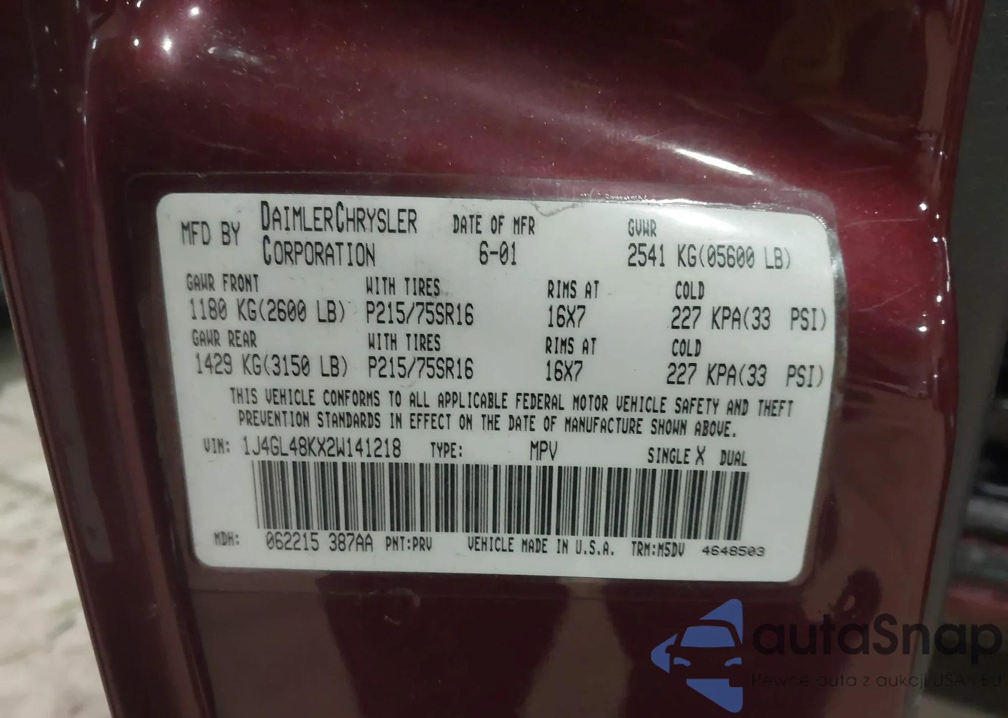 • VIN 1J4GL48KX2W141218