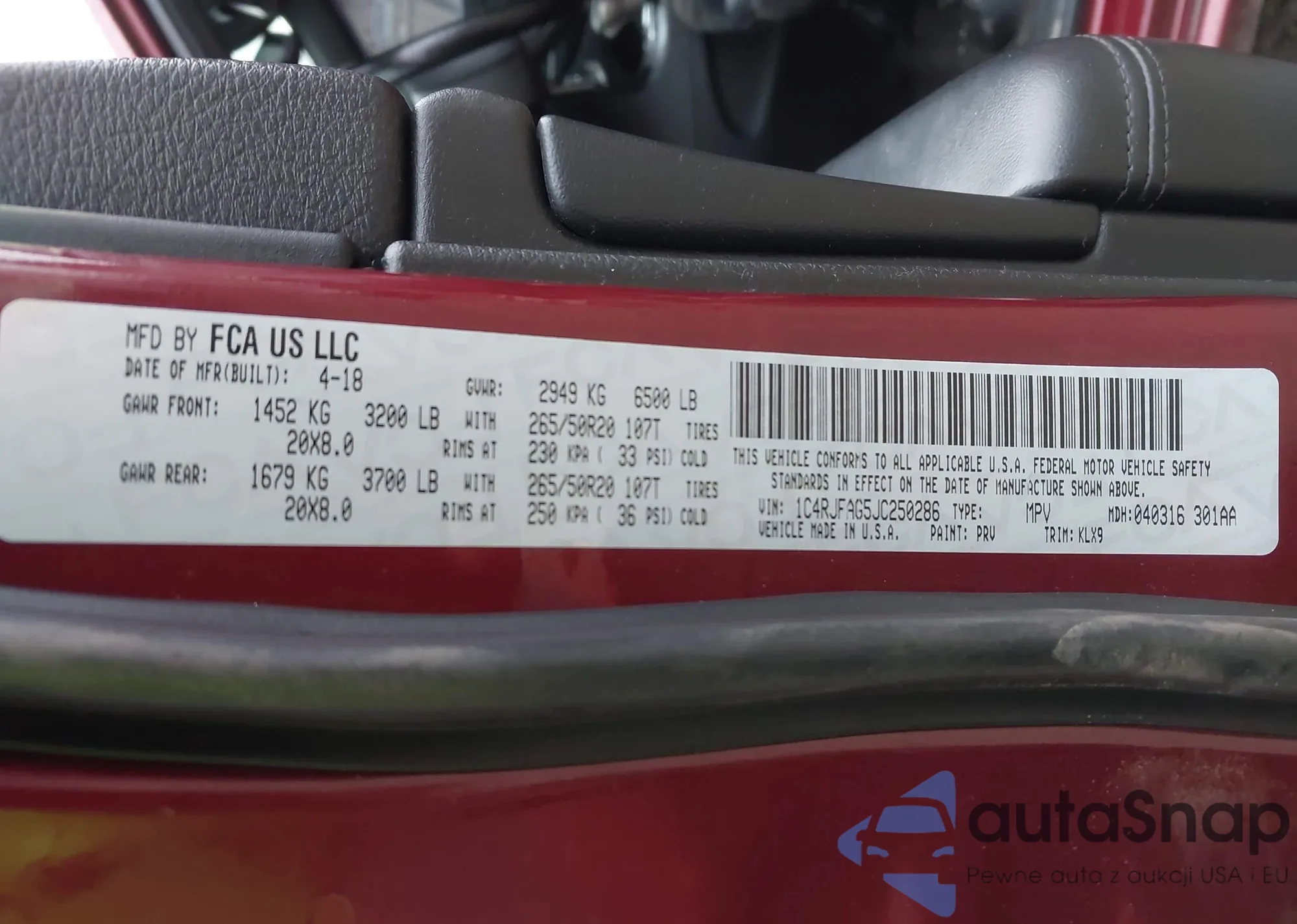 • VIN 1C4RJFAG5JC250286