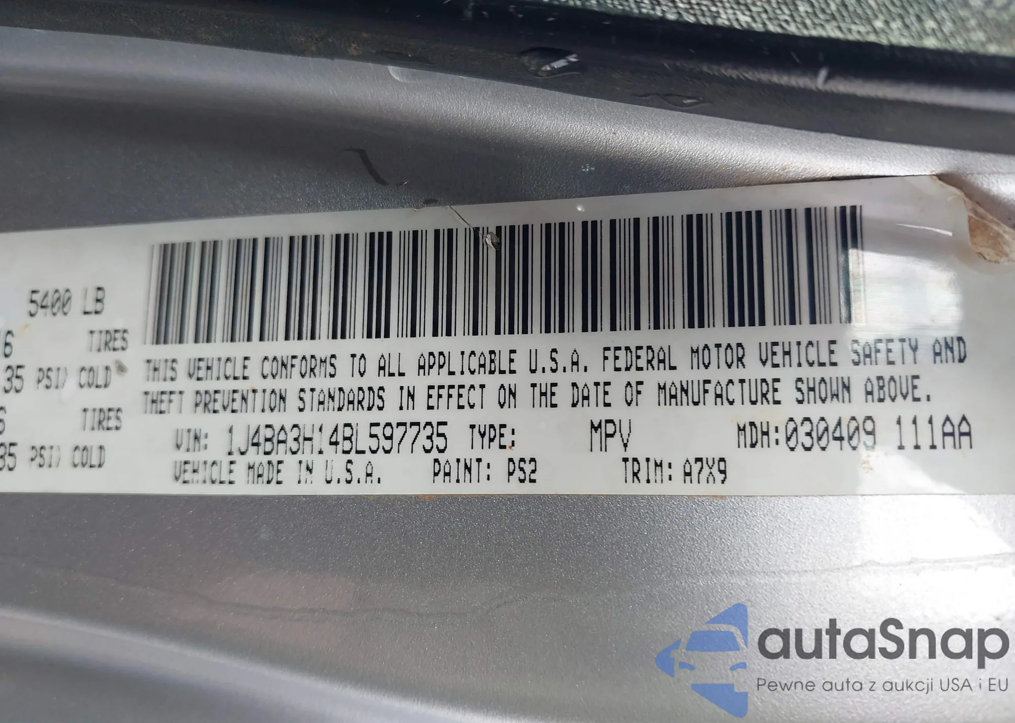 LOT: 43949006 VIN: 1J4BB5H18AL109197