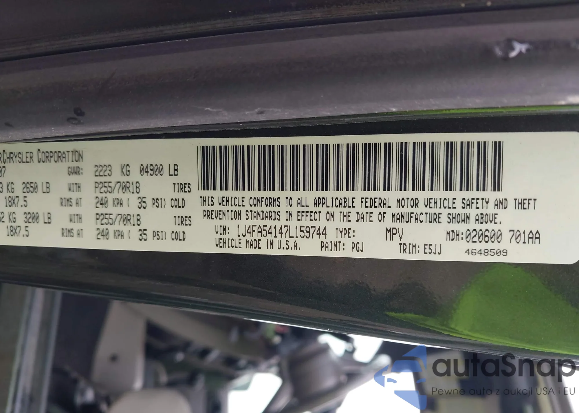 LOT: 43261604 VIN: 1J4FA54147L159744