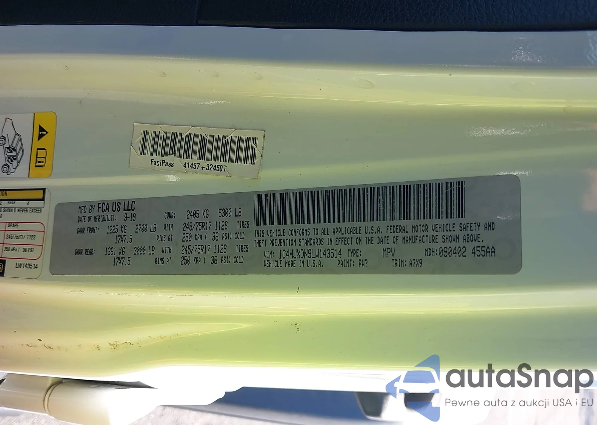 LOT: 52436505 VIN: 1C4HJXFG0LW112277