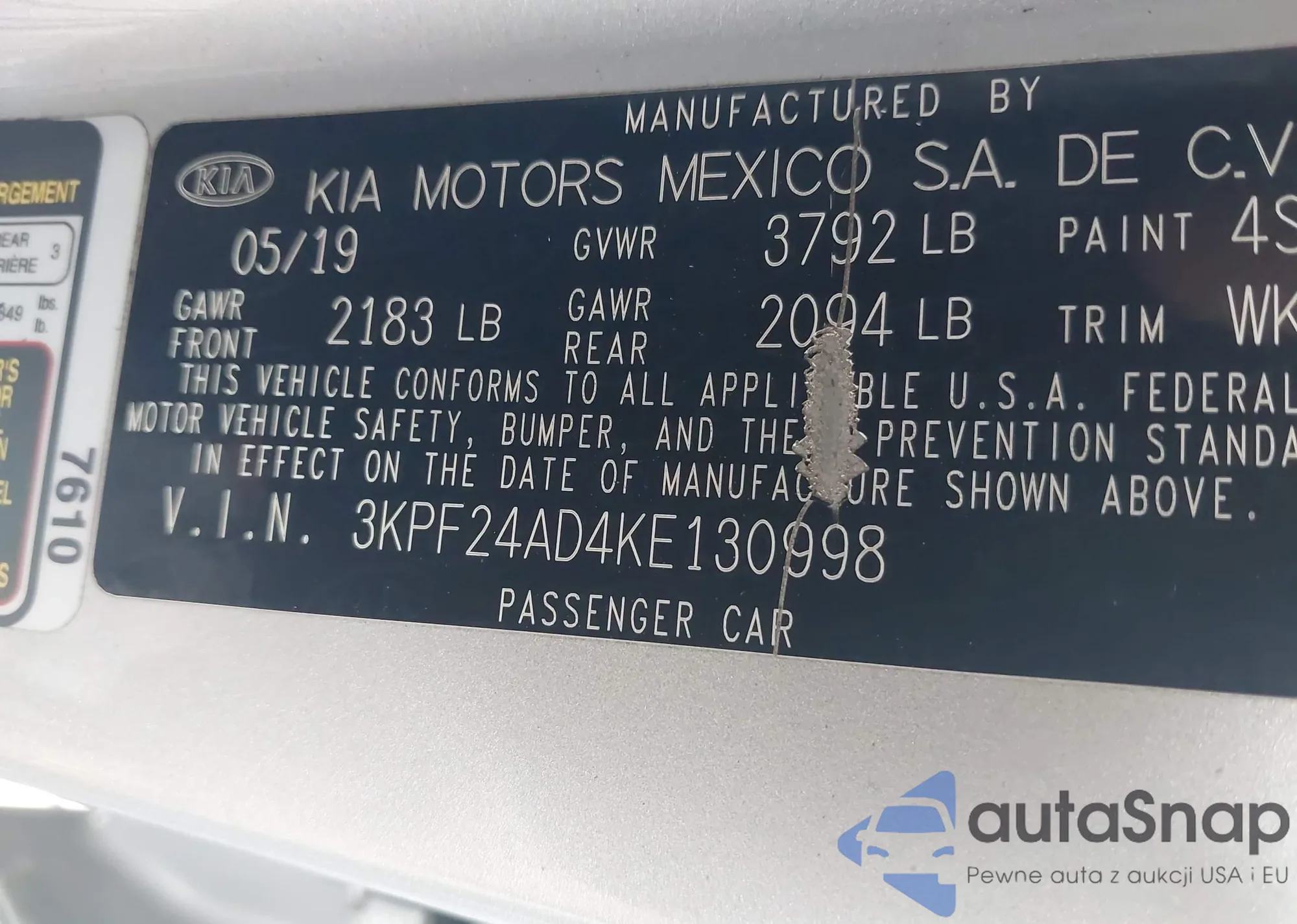 LOT: 43132801 VIN: 3KPF24AD1KE005778