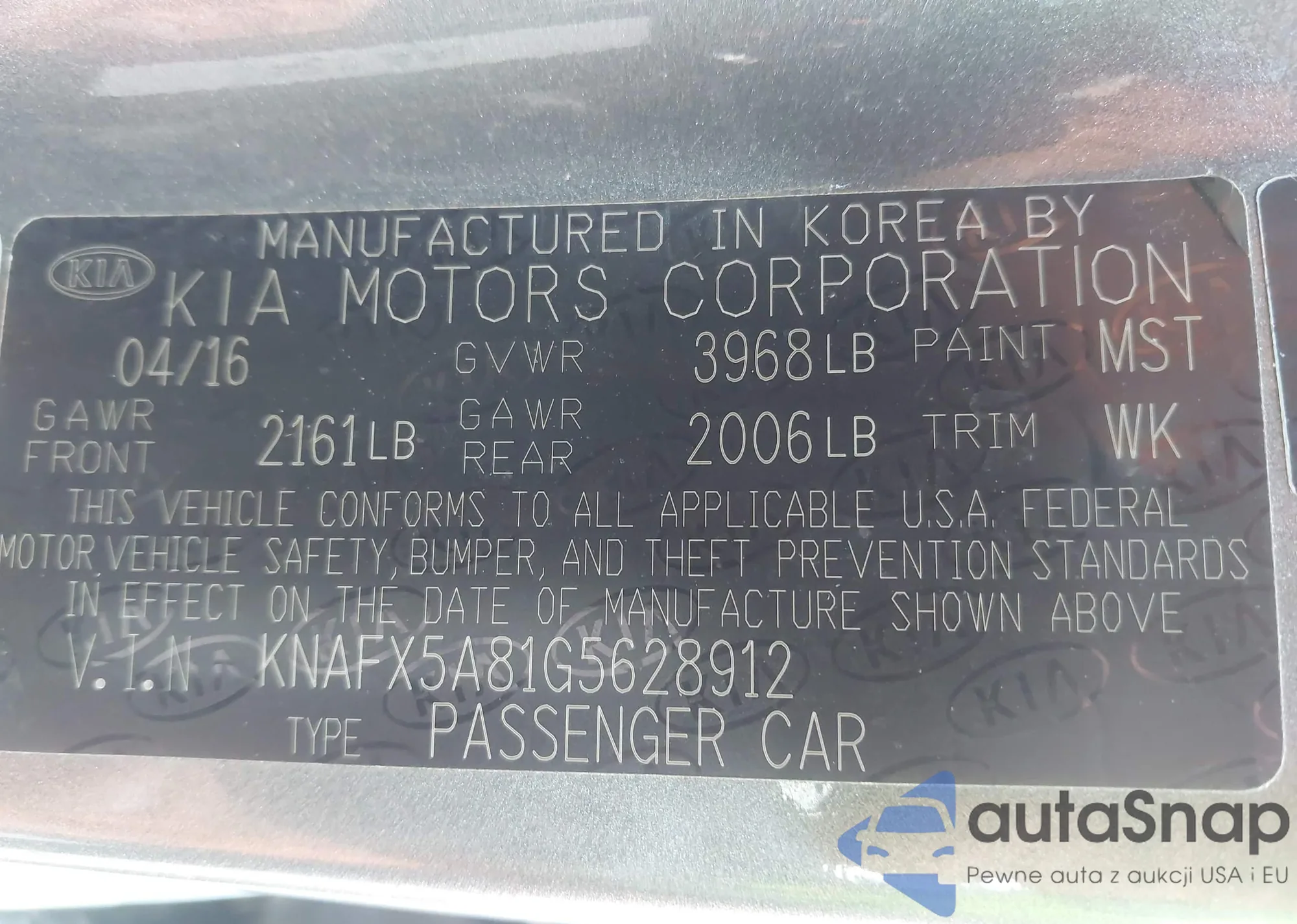 LOT: 43991778 VIN: KNAFX5A81G5628912