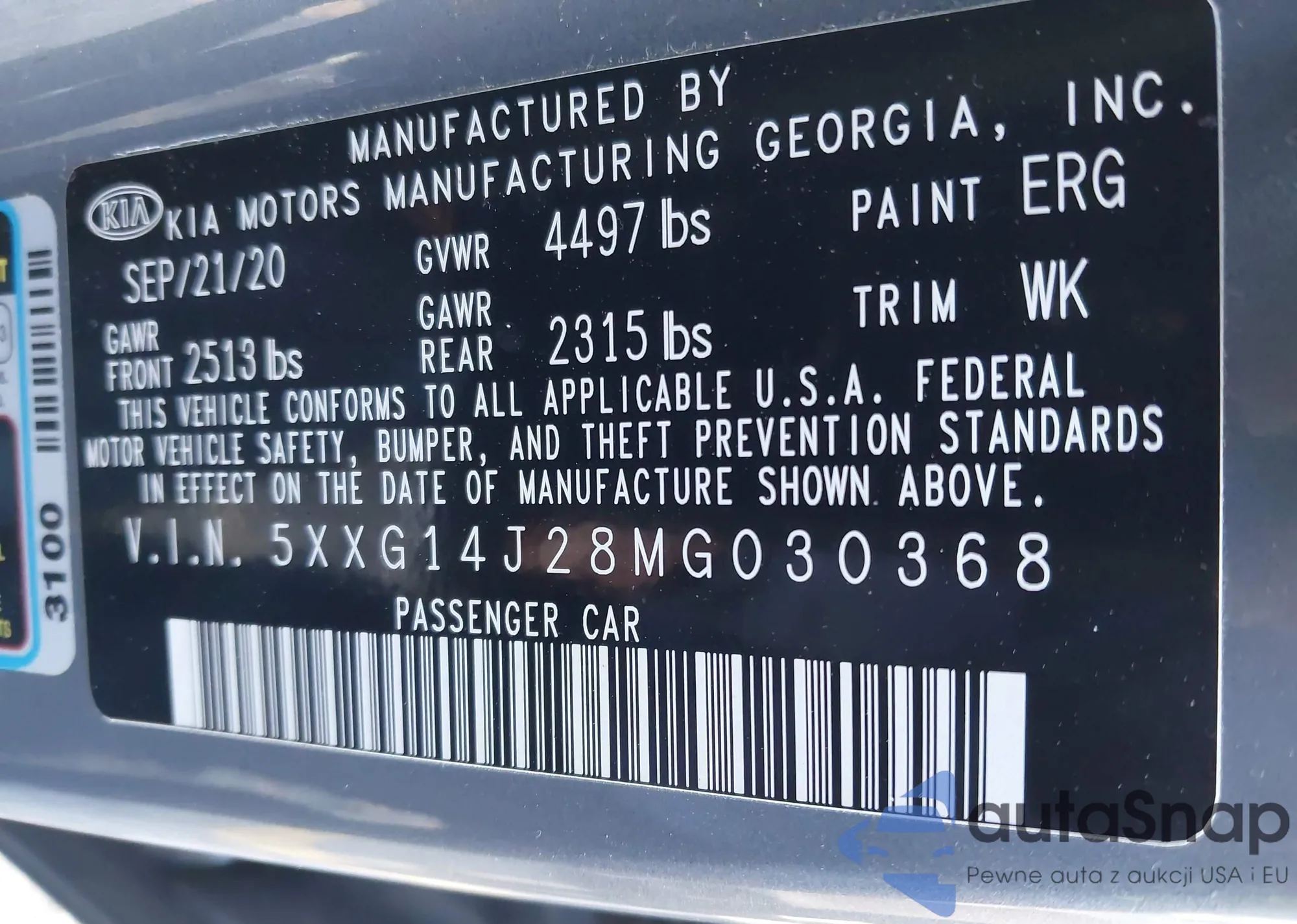 LOT: 40290470 VIN: 5XXG14J28MG030368