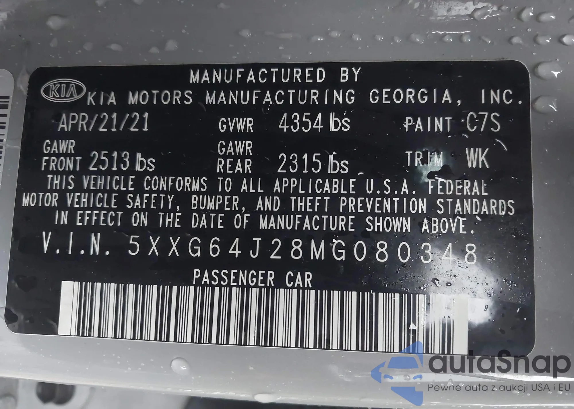 LOT: 42505541 VIN: 5XXG34J24MG080680