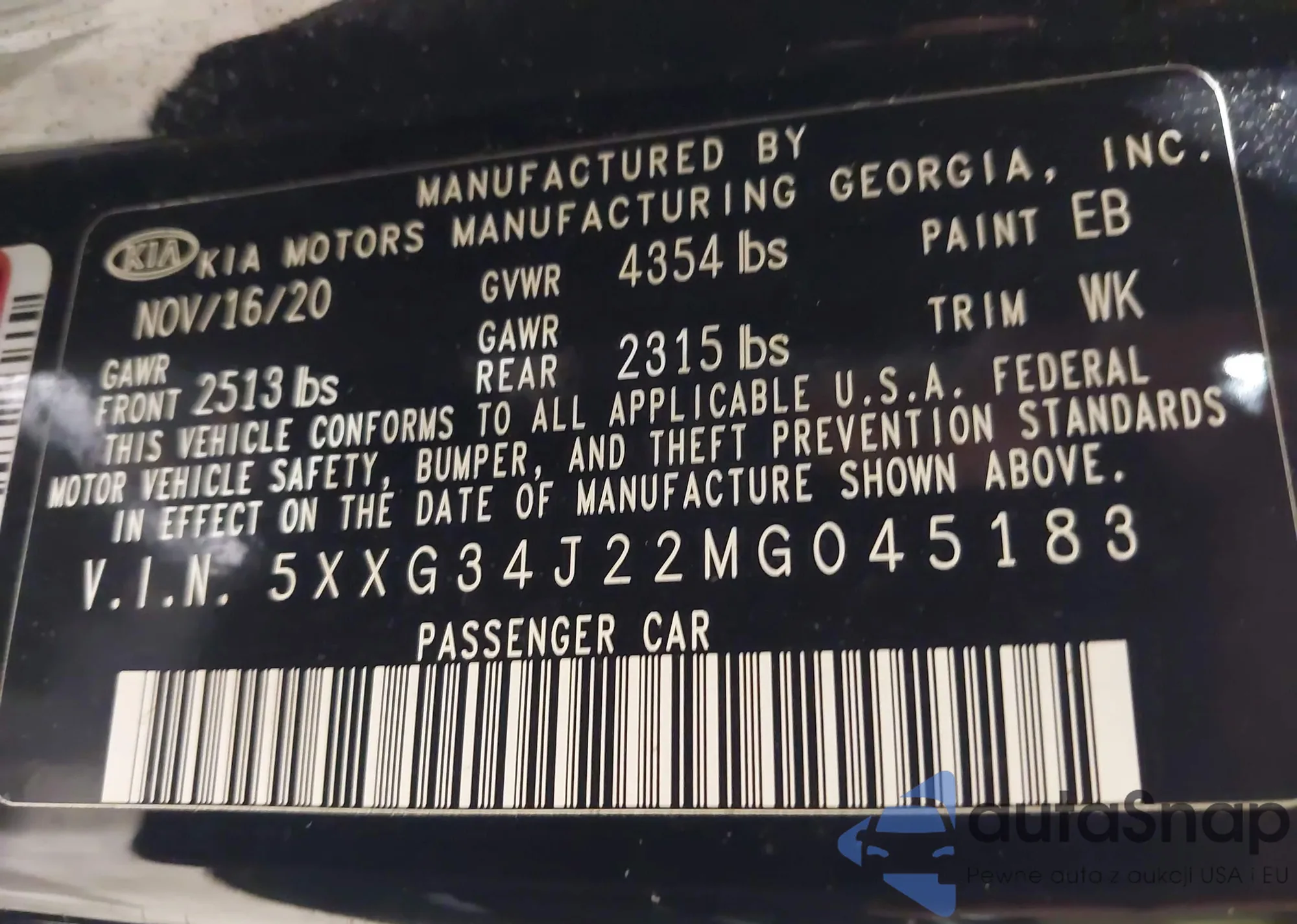 LOT: 44506161 VIN: 5XXG34J22MG045183