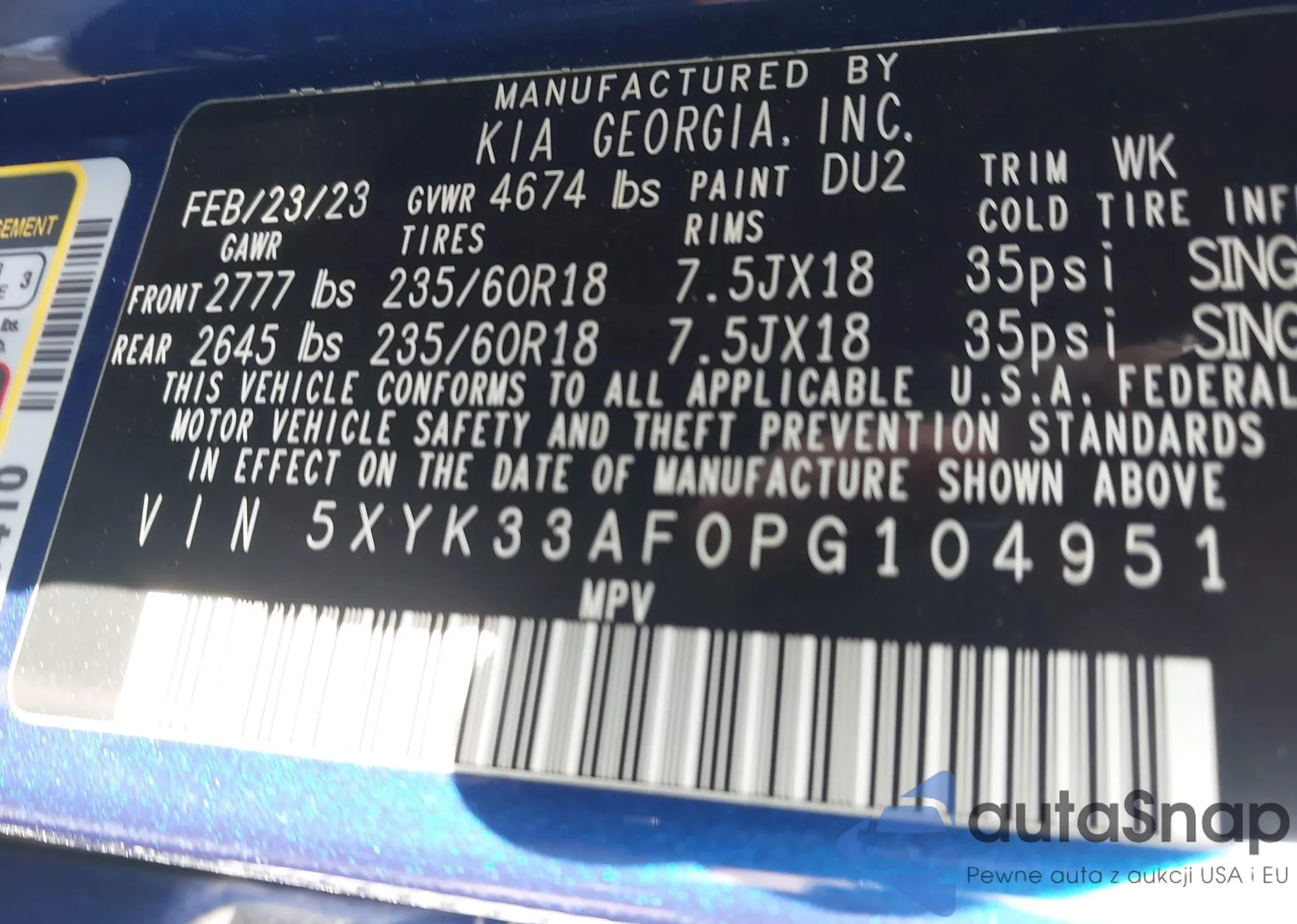 • VIN 5XYK33AF0PG104951