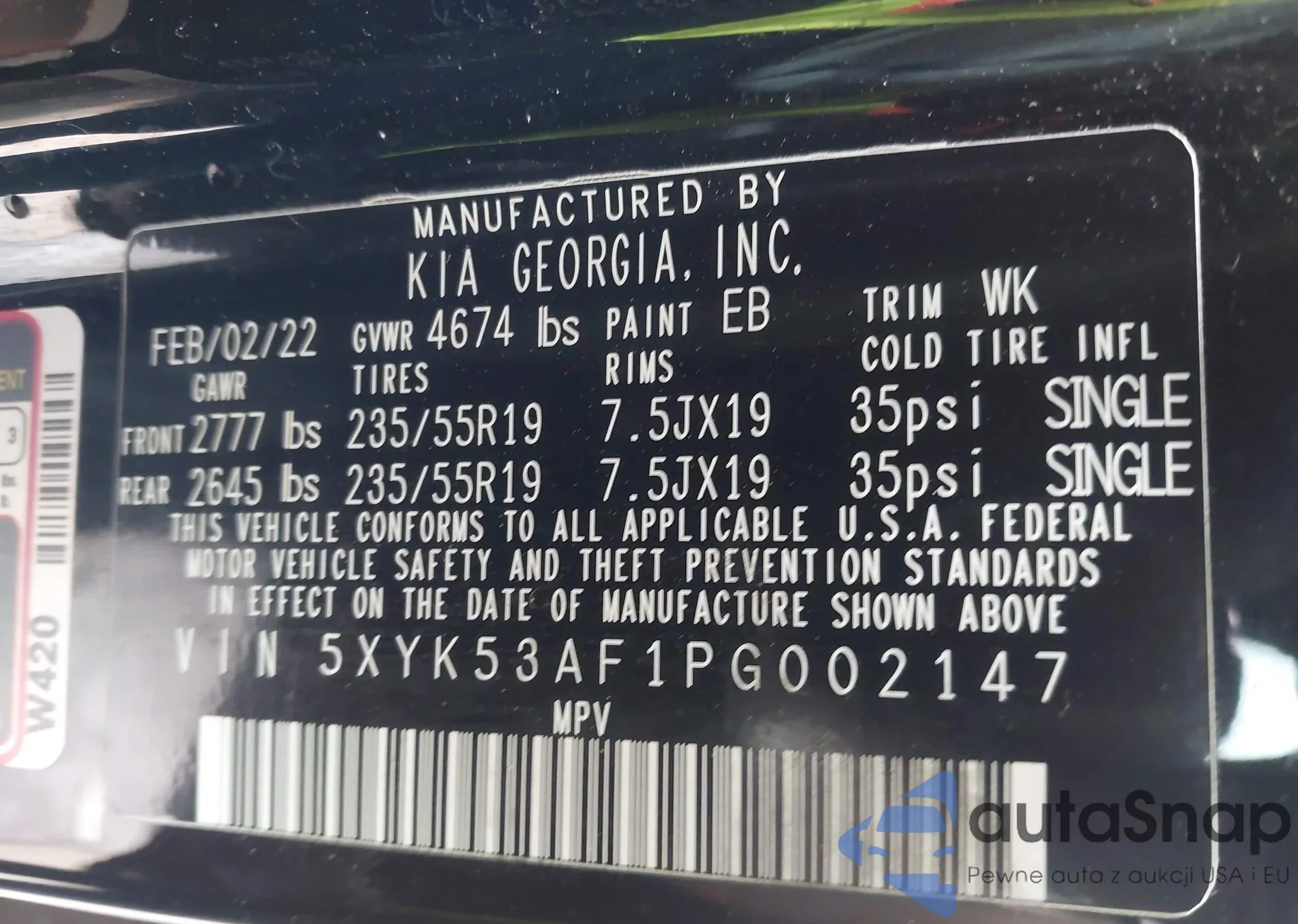 • VIN 5XYK53AF1PG002147