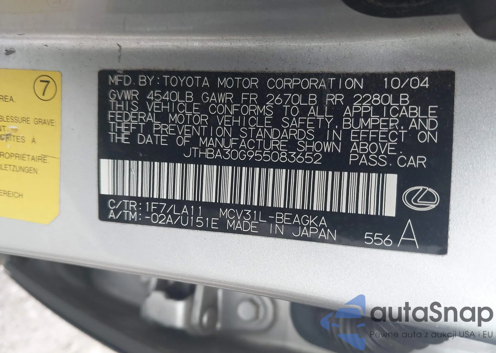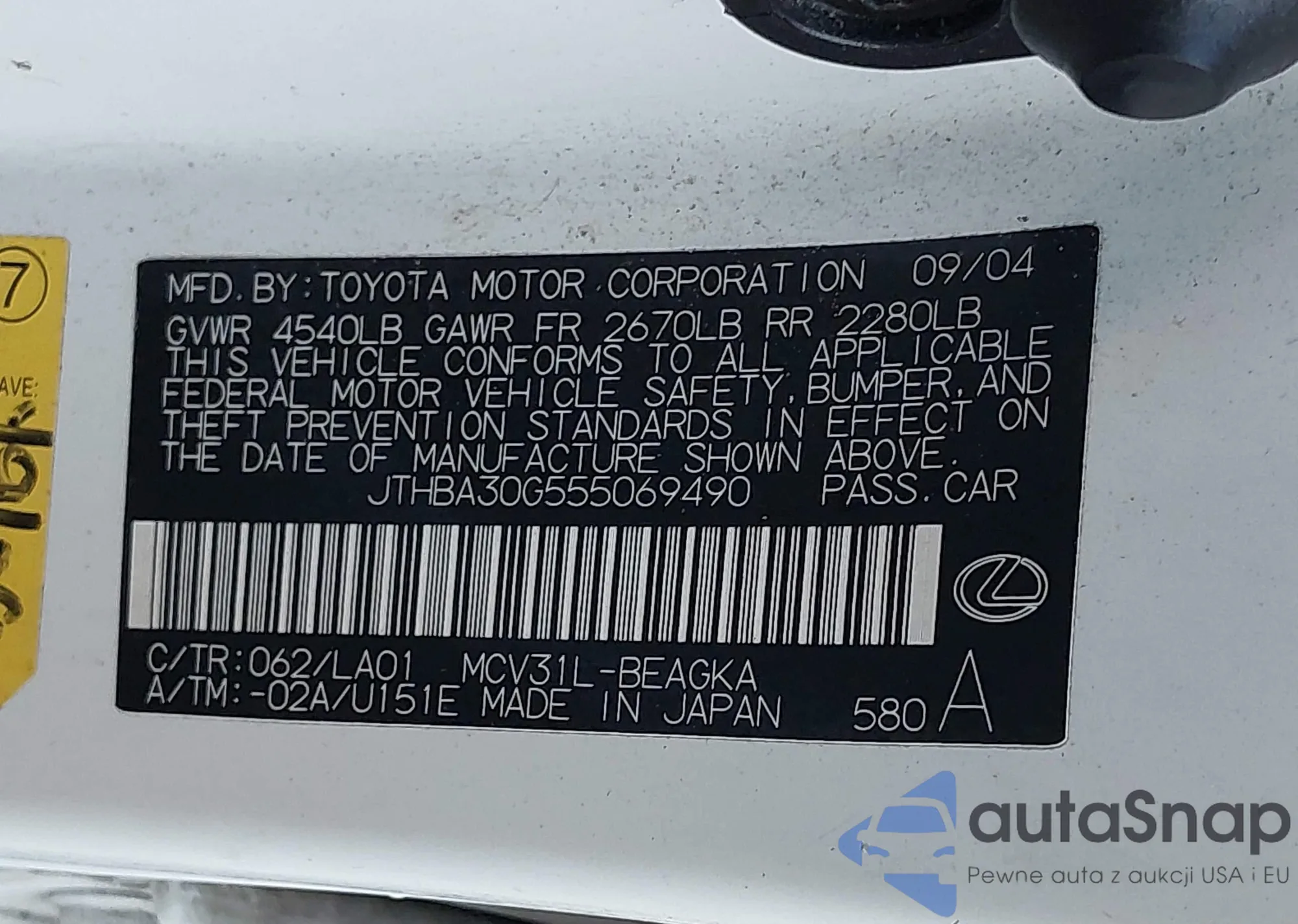 LOT: 44400357 VIN: JTHBA30G955083652