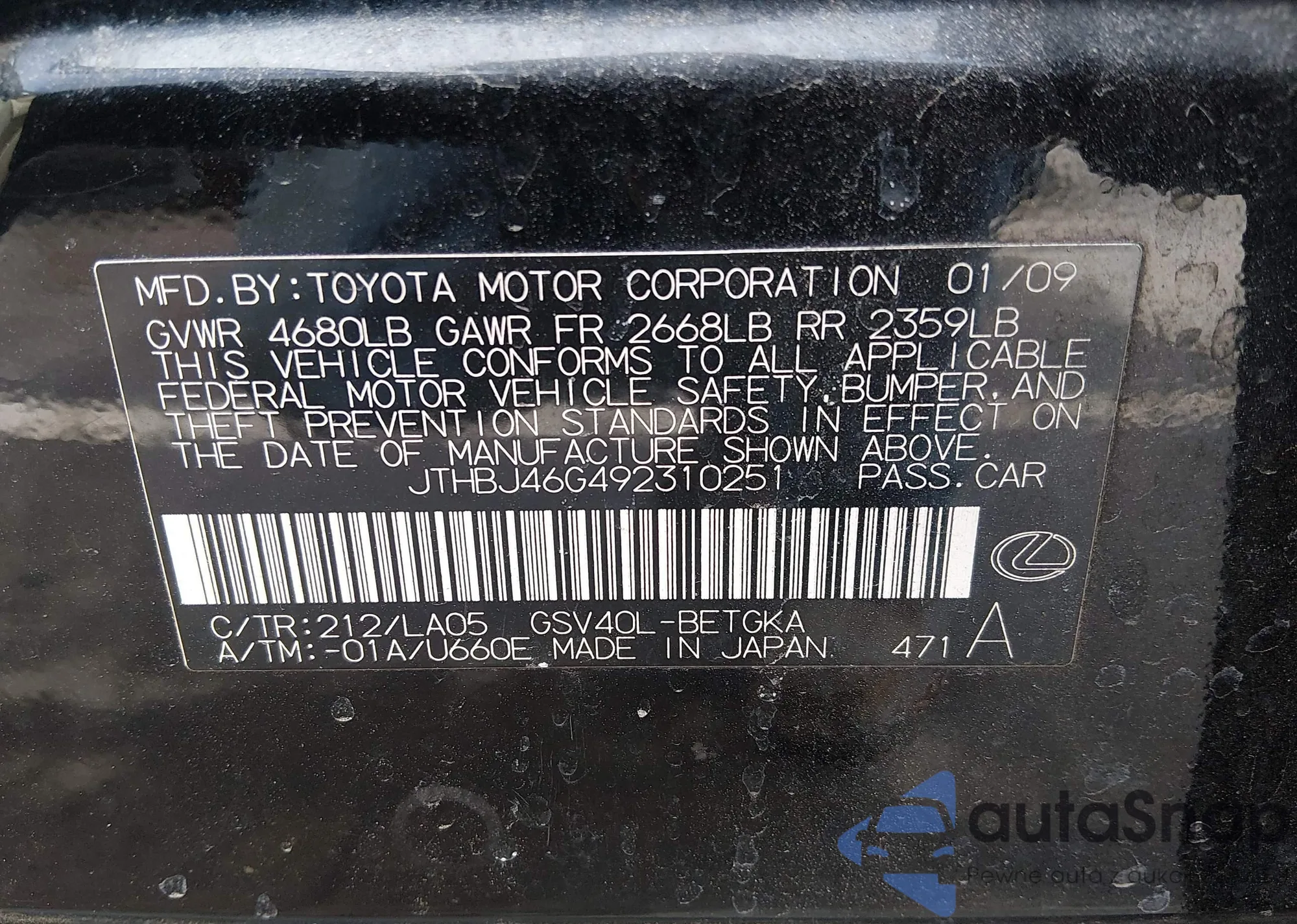 LOT: 44370260 VIN: JTHBJ46G492310251