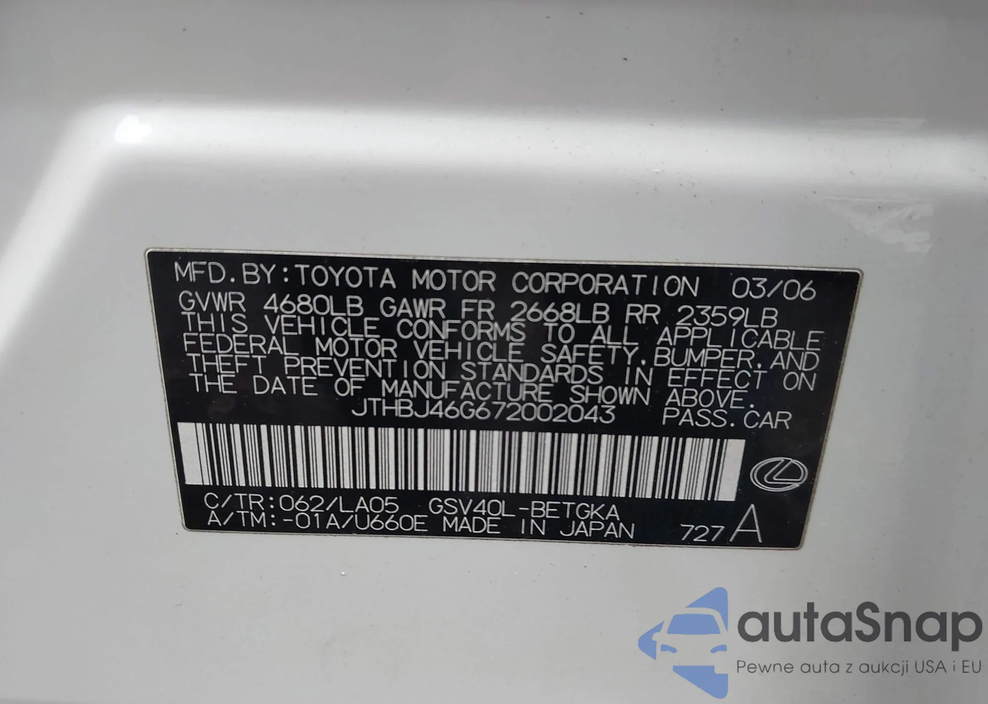 LOT: 43970828 VIN: JTHBJ46G672002043