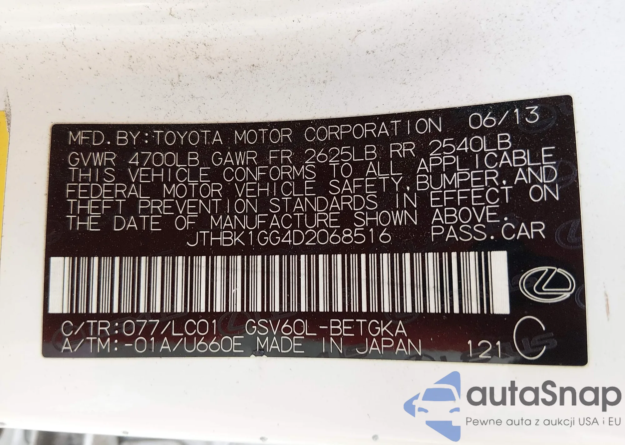 LOT: 44432128 VIN: JTHBK1GG4D2068516